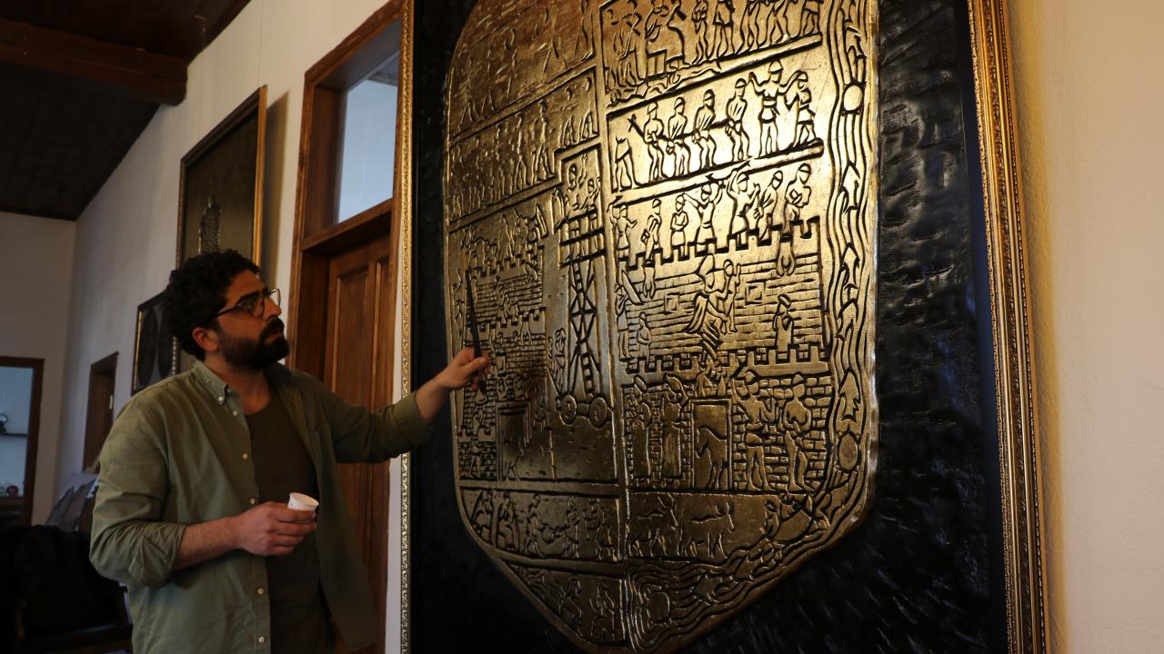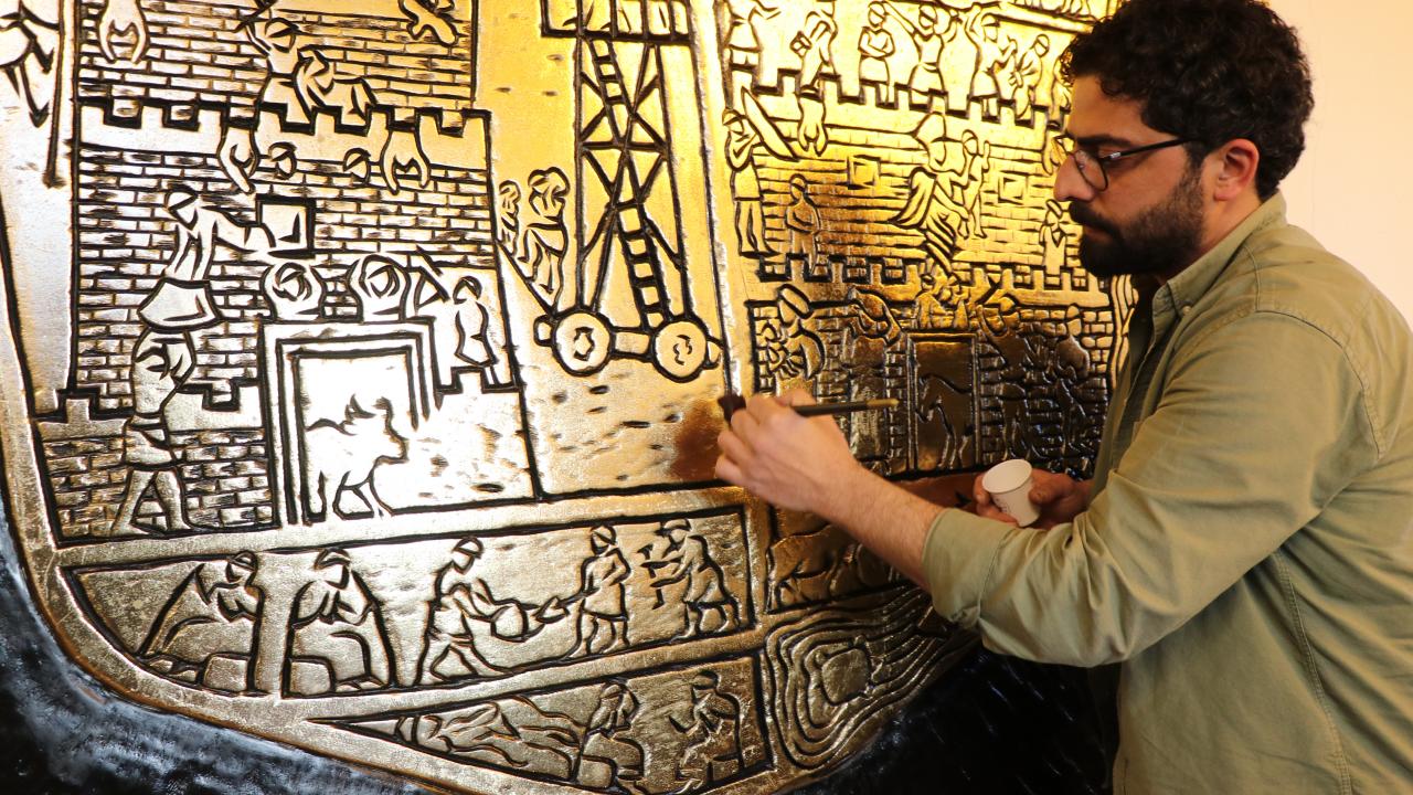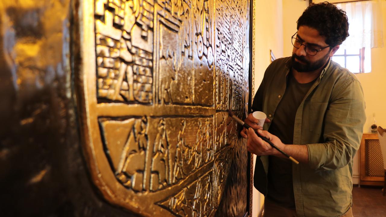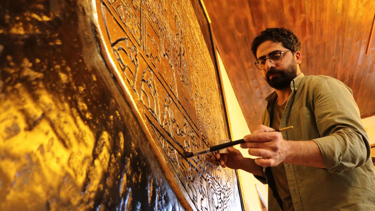 Tarihi çok sevdiğini dile getiren Bakır, "Kabartmayı ilk önce ahşabın üzerine çizdim ve oyma işlemini gerçekleştirdim. Ondan sonra varaklayıp görseli bitirdim. Varak sanatı ile oymayı birleştirince ayrı bir sanat ortaya çıkıyor. Görsel eskitilmiş güzel bir hal alıyor." dedi.