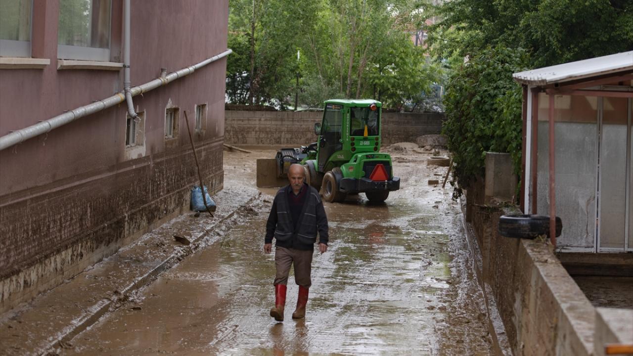Ankara`nın Elmadağ ilçesinde dün akşam saatlerinde etkili olan şiddetli yağış sonrası su baskınlarının olduğu cadde ve sokaklardaki temizlik ve tahliye çalışmaları devam ediyor.