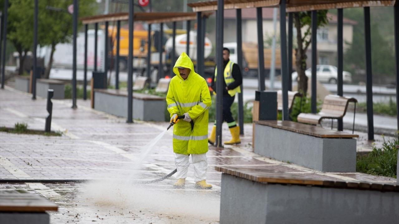 Ankara'nın Elmadağ ilçesinde dün akşam saatlerinde etkili olan şiddetli yağış sonrası su baskınlarının olduğu cadde ve sokaklardaki temizlik ve tahliye çalışmaları devam ediyor.