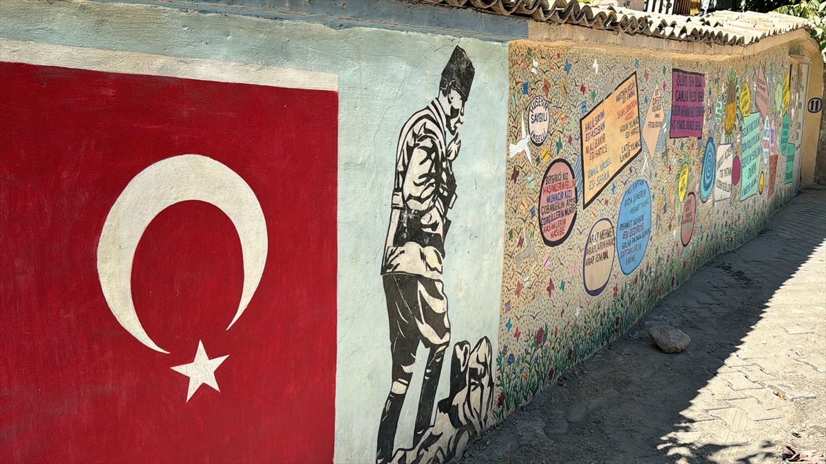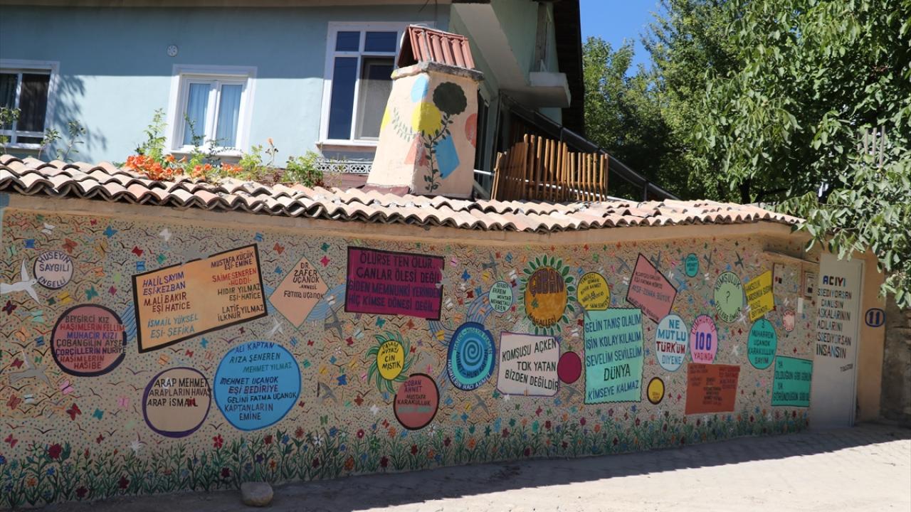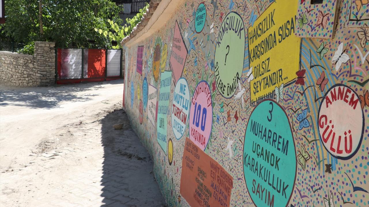 Karabük'ün Safranbolu ilçesinde yaşayan emekli sınıf öğretmeni Yunus Sayım, köyündeki evlerin bahçe duvarlarını, yaptığı resimler ve yazdığı özlü sözlerle güzelleştiriyor.