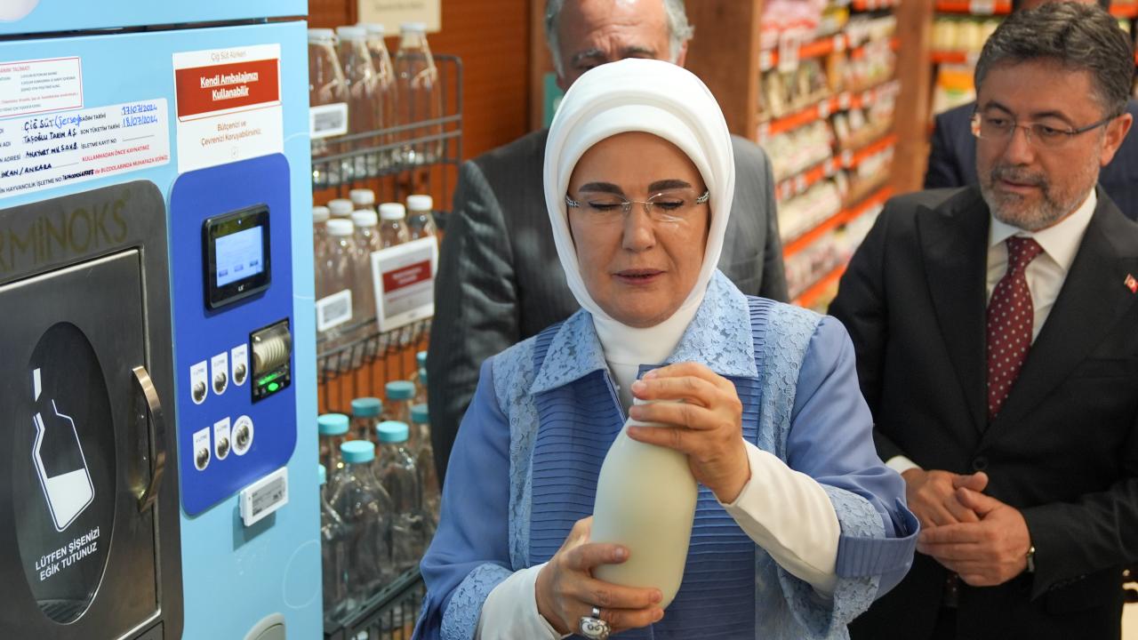 Cumhurbaşkanı Recep Tayyip Erdoğan'ın eşi Emine Erdoğan, Ankara'da atıksız alışverişi teşvik eden marketi ziyaret etti, tek kullanımlık ambalajların önüne geçerek atıkları en aza indiren dolum istasyonlarını inceledi.
