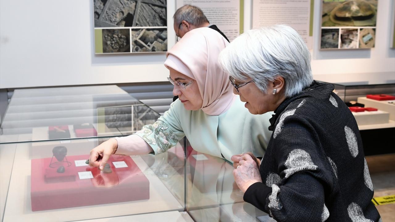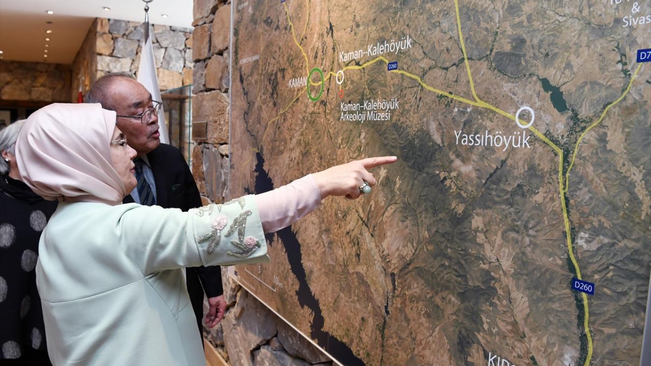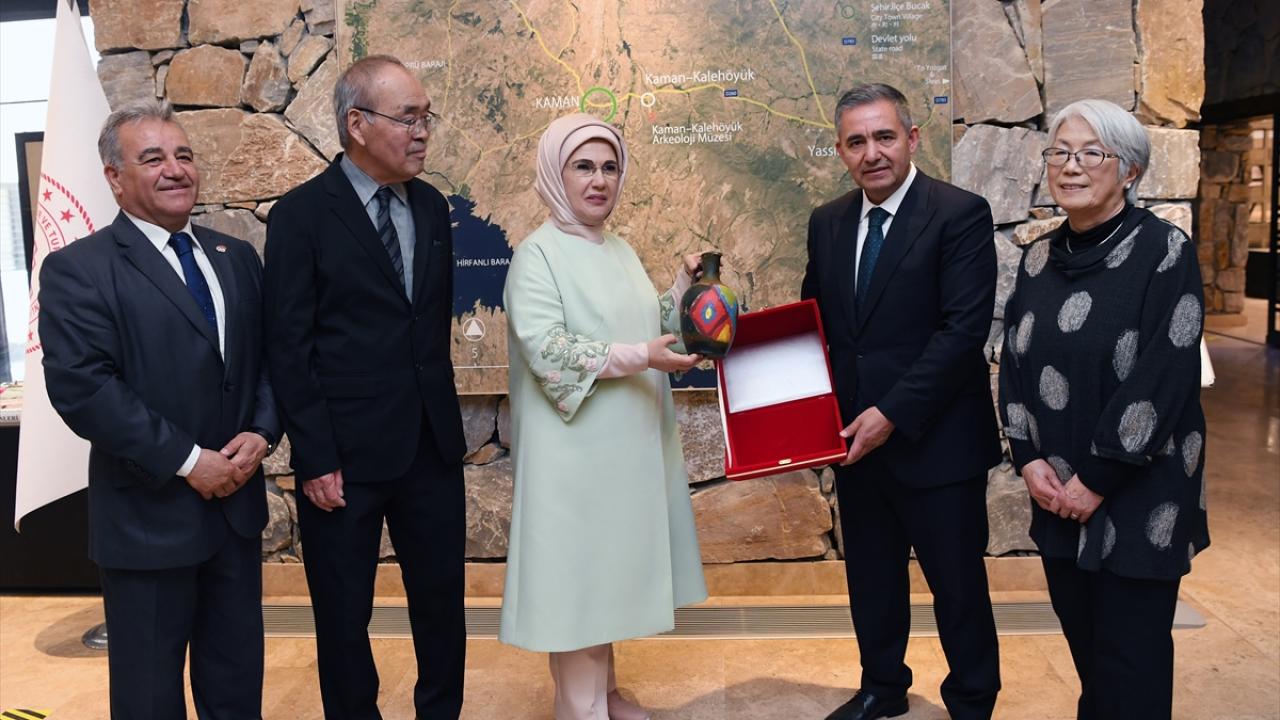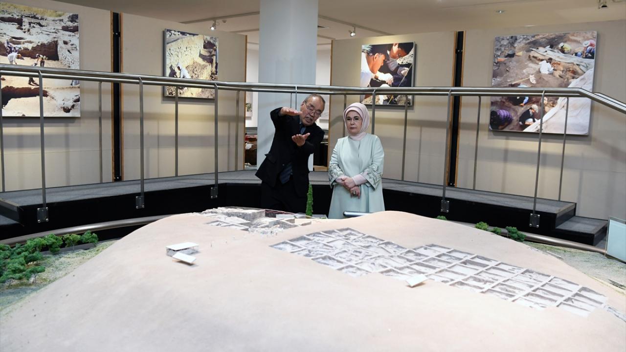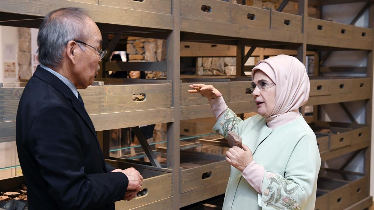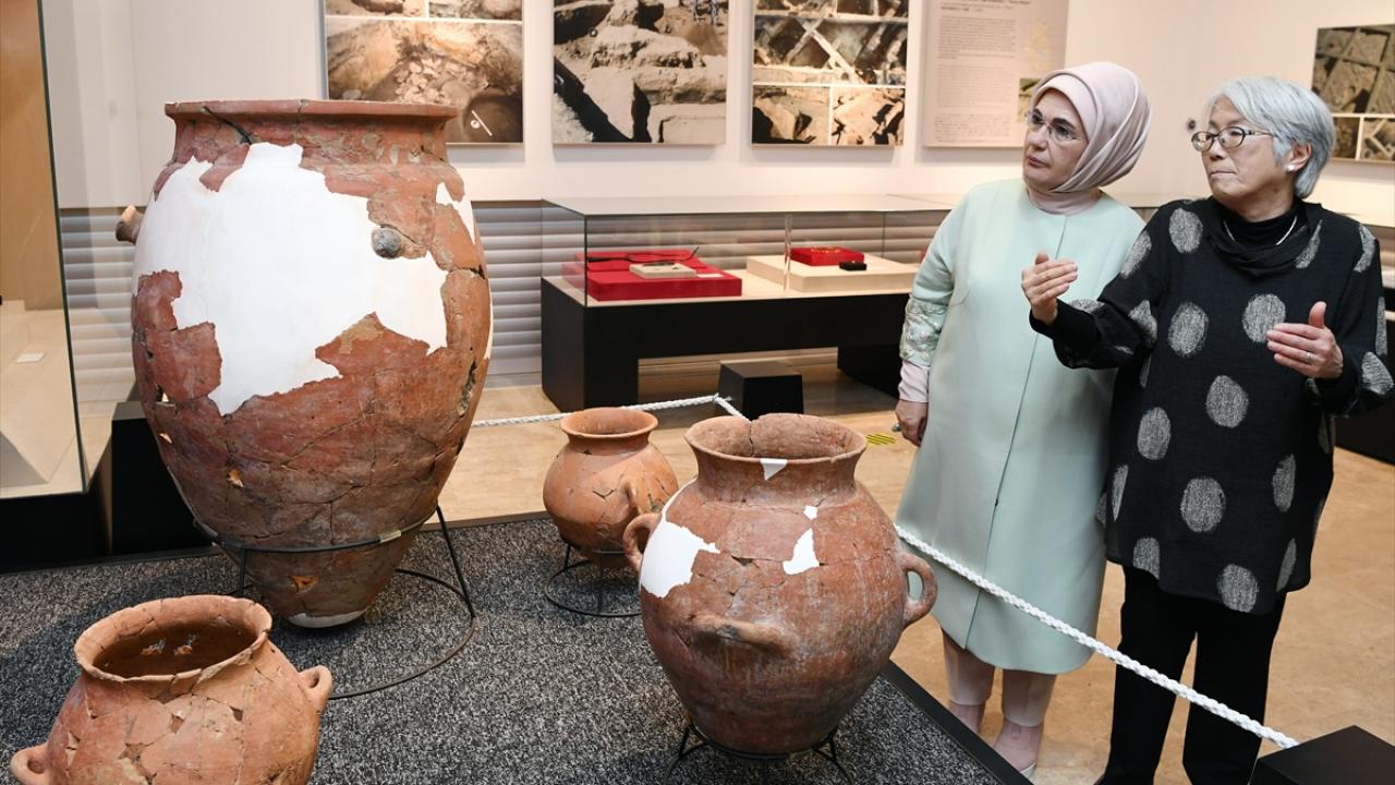 Müzede çalışan yöresel kıyafetli Japonlar tarafından karşılanan Emine Erdoğan, arkeolojik kazılarda bulunan eserler hakkında Japon Anadolu Arkeoloji Enstitüsü Başkanı Dr. Sachihiro Omura`dan bilgi aldı.