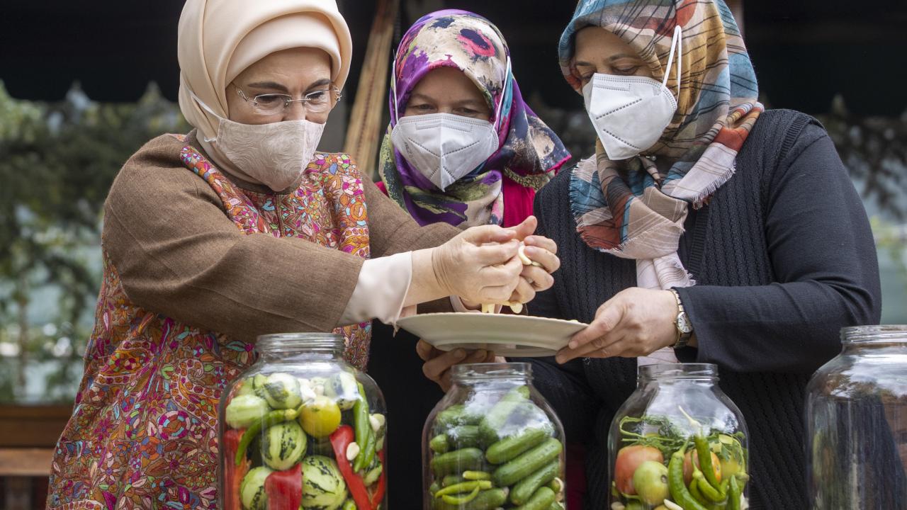 Evde salatalık ve lahana turşusunu daha fazla tükettiklerini anlatan Emine Erdoğan, kurduğu turşuları da eve götüreceğini ifade etti.