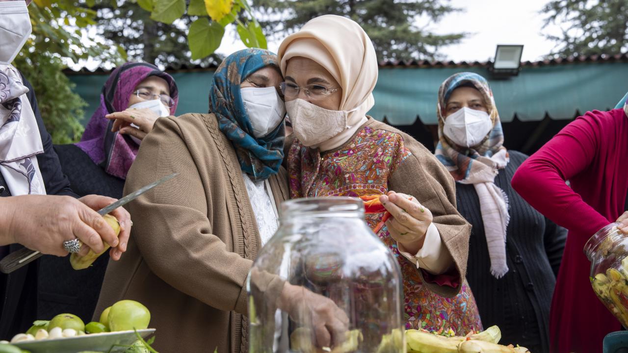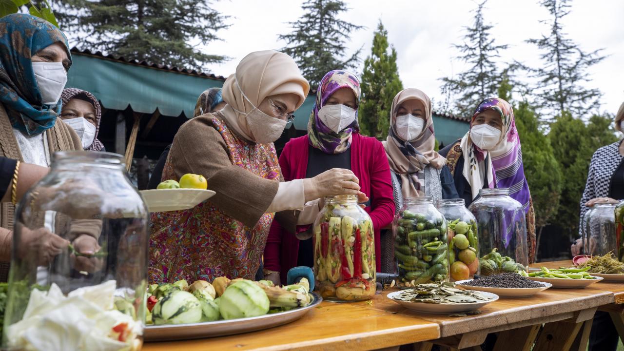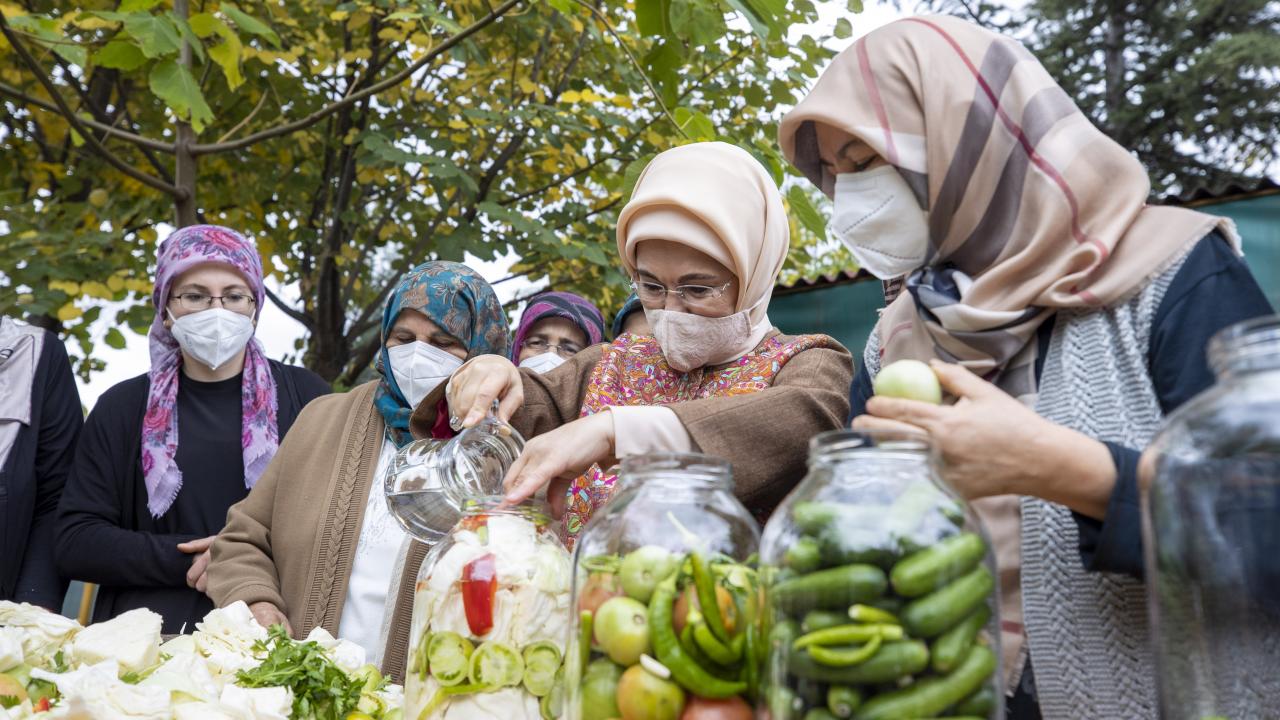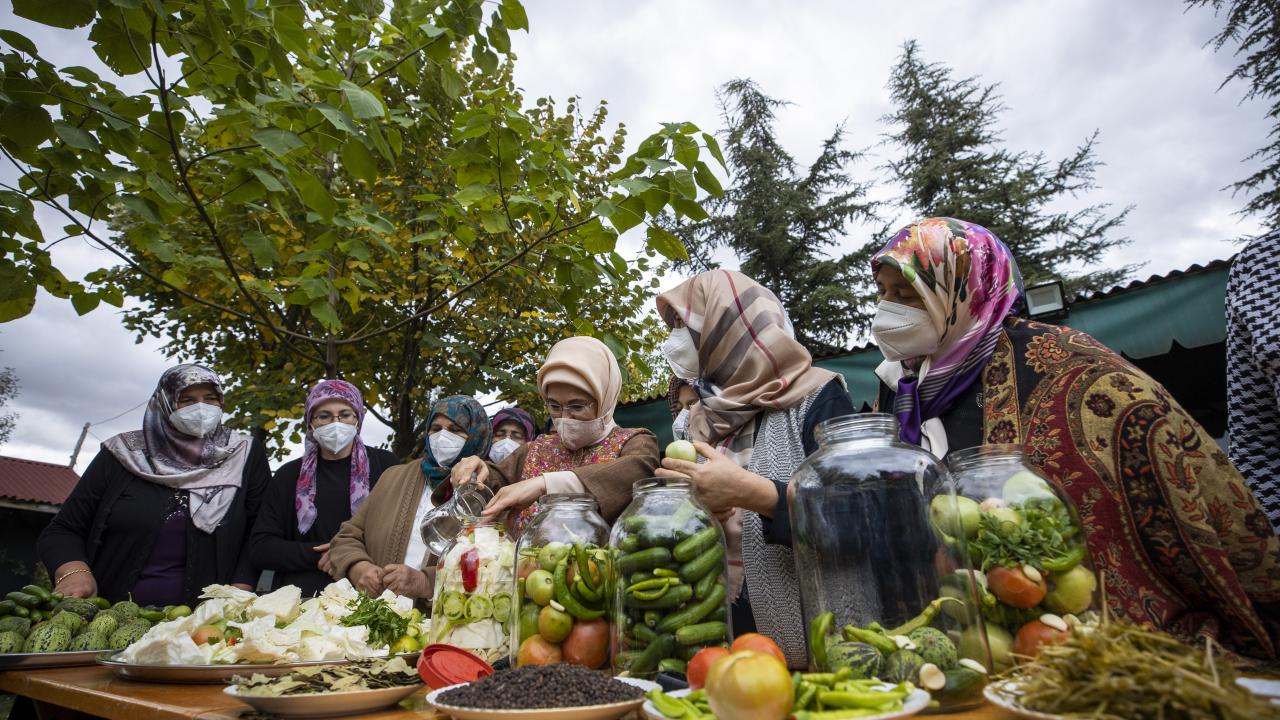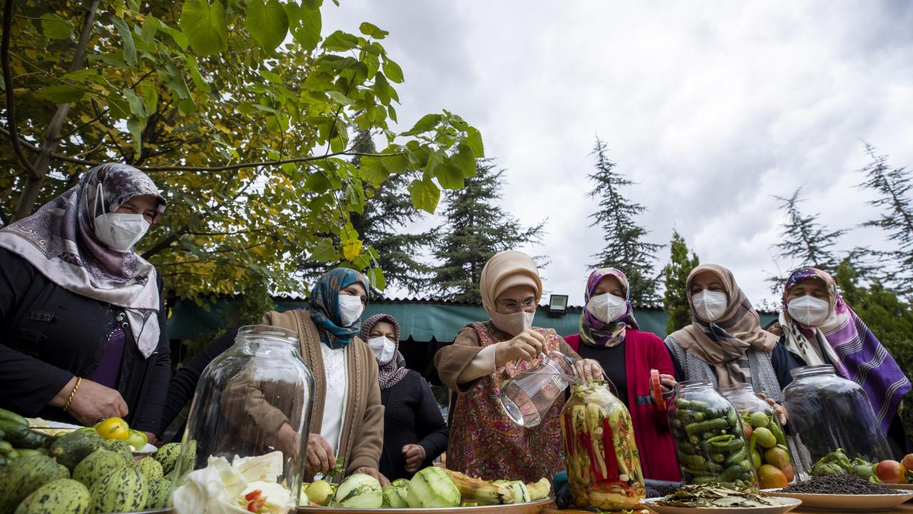 Cumhurbaşkanı Recep Tayyip Erdoğan'ın eşi Emine Erdoğan, Ankara'nın Çubuk ilçesine bağlı Aşağı Çavundur mahallesine gelerek, Çubuklu kadınların turşu kurma etkinliğine katıldı.