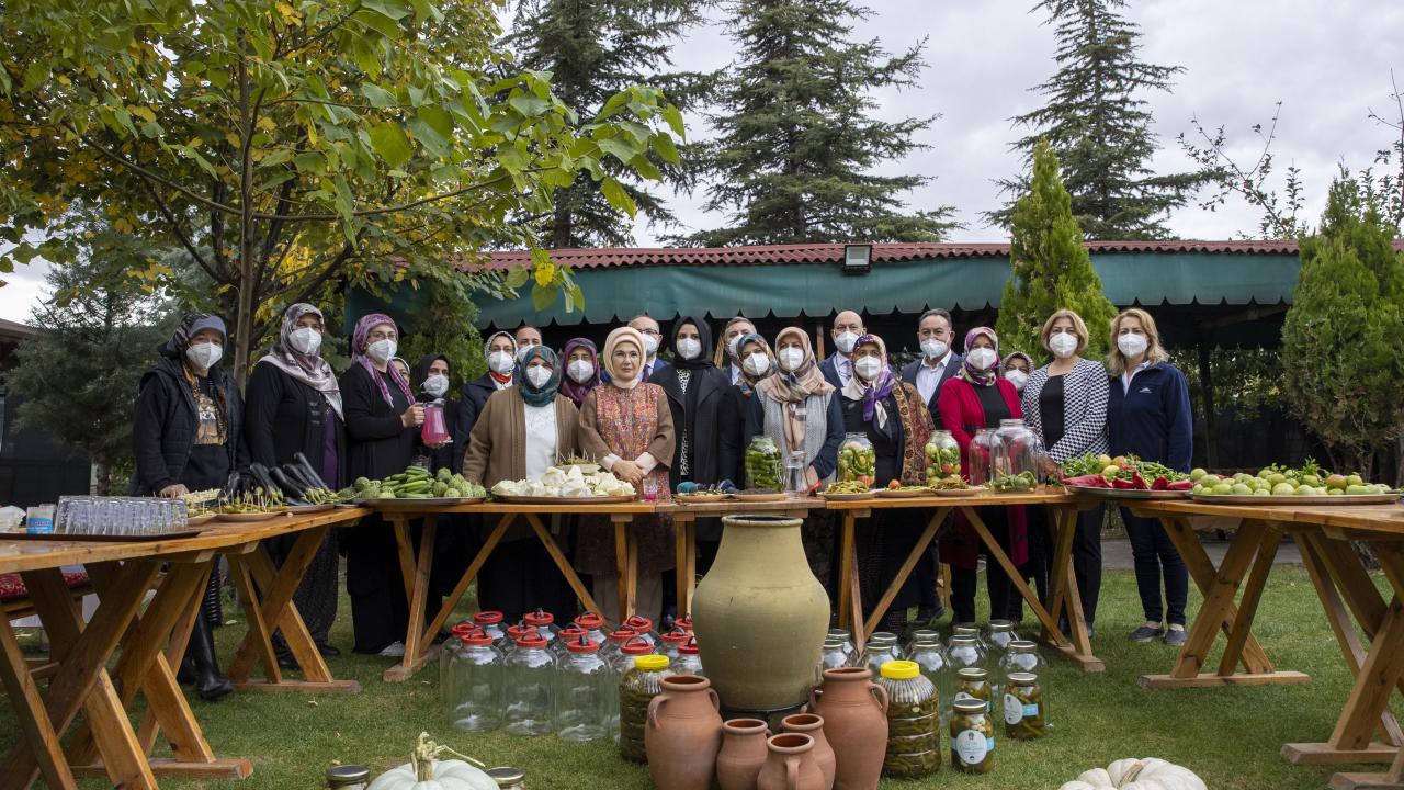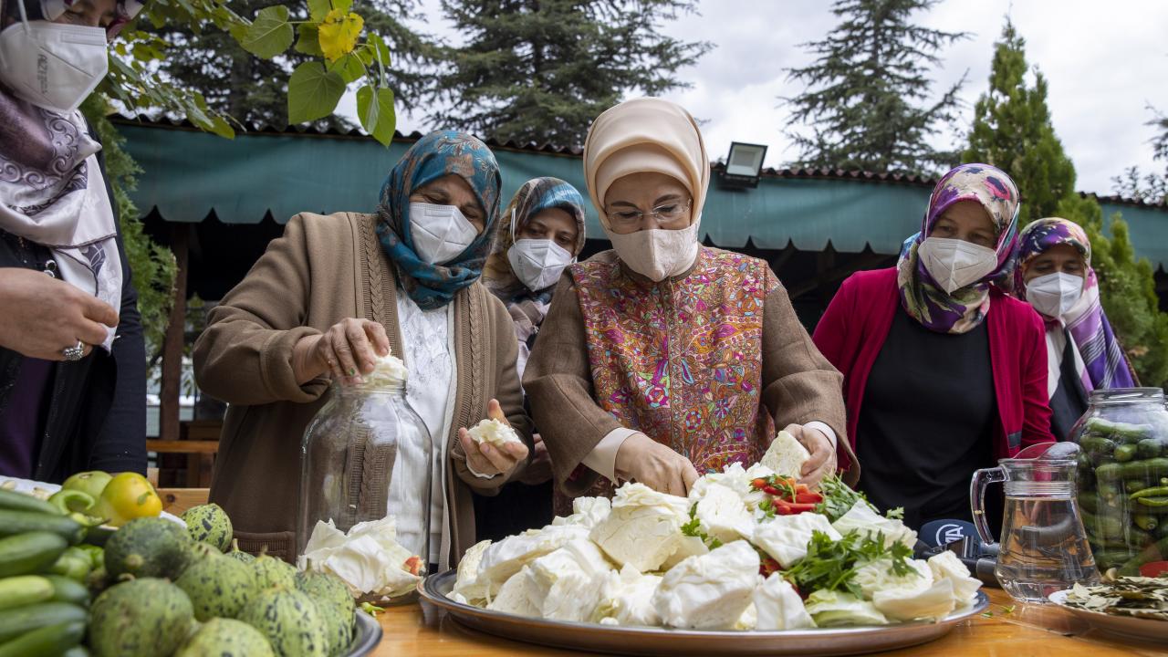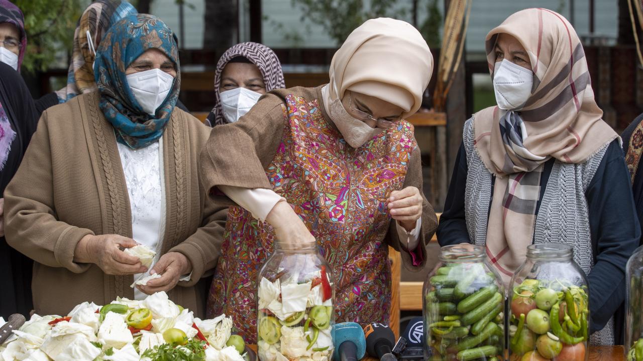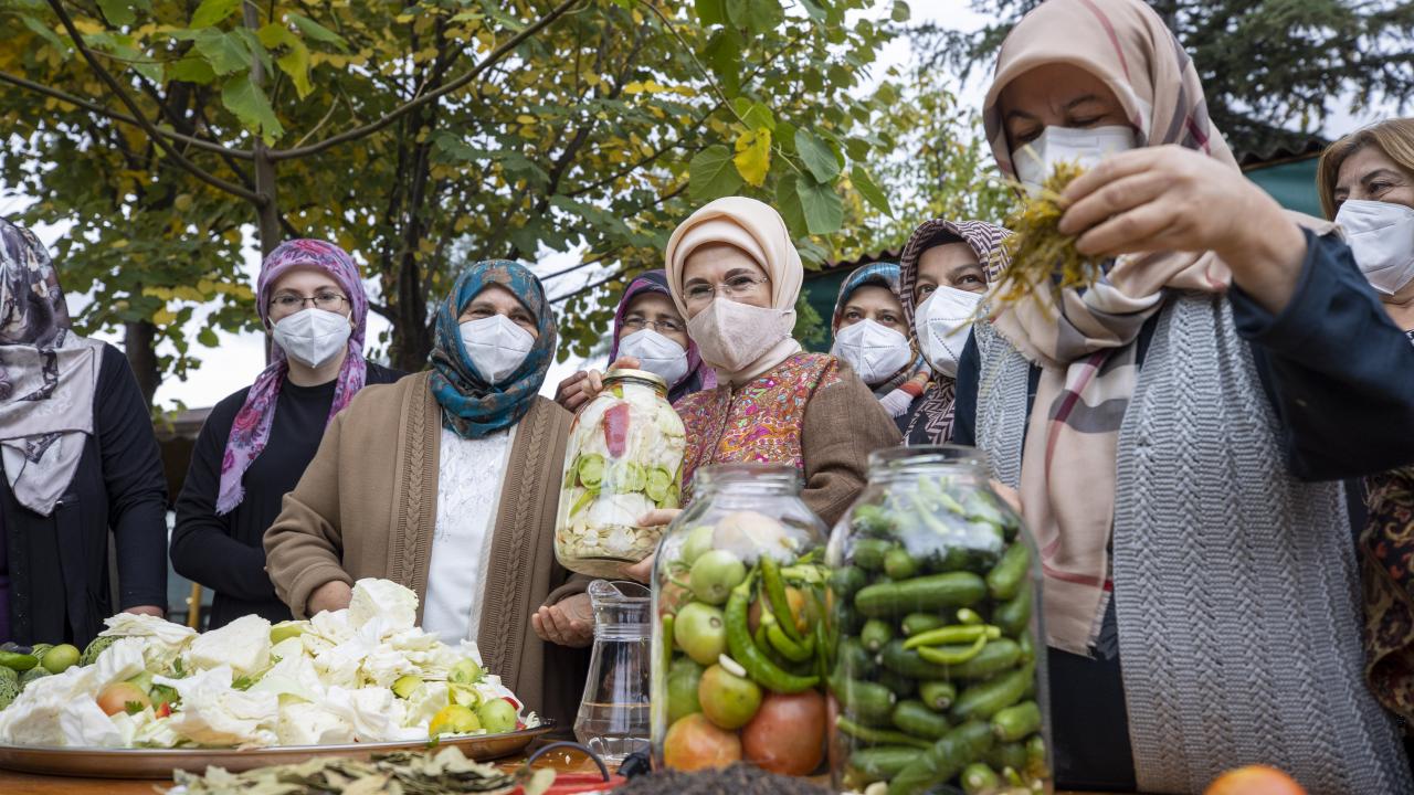 Cumhurbaşkanı Recep Tayyip Erdoğan'ın eşi Emine Erdoğan, Ankara'nın Çubuk ilçesine bağlı Aşağı Çavundur mahallesine gelerek, Çubuklu kadınların turşu kurma etkinliğine katıldı.