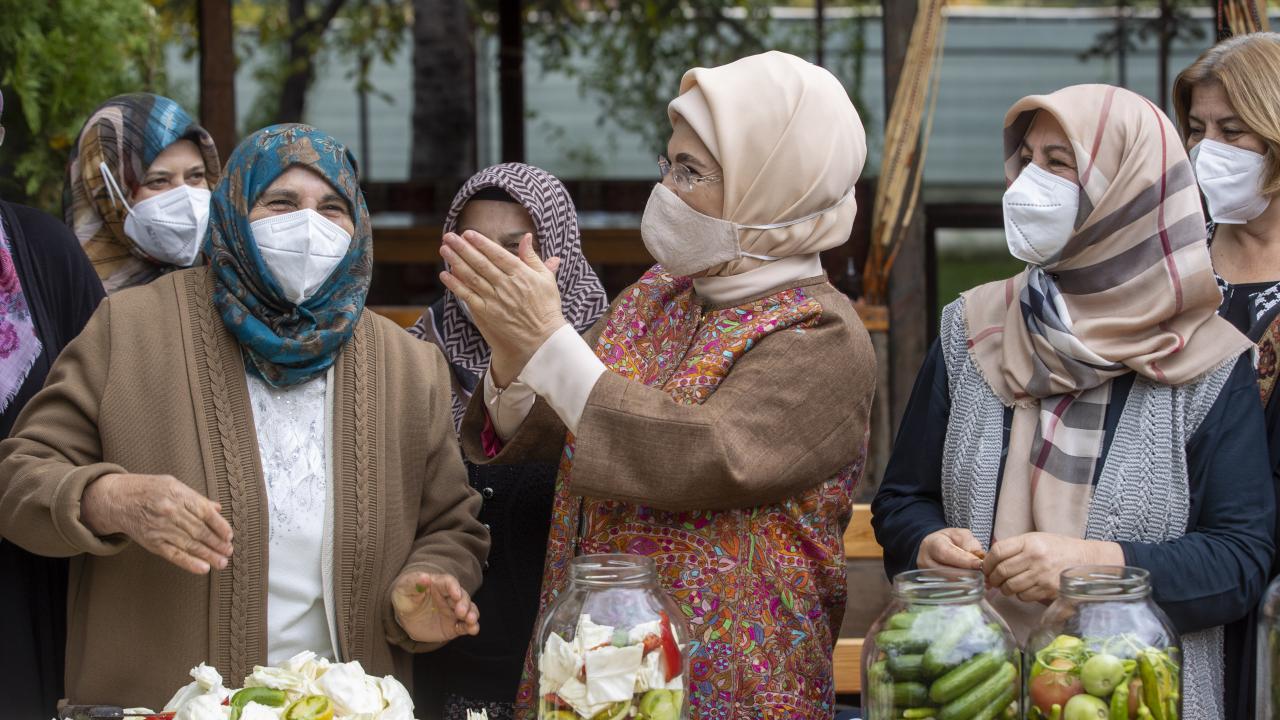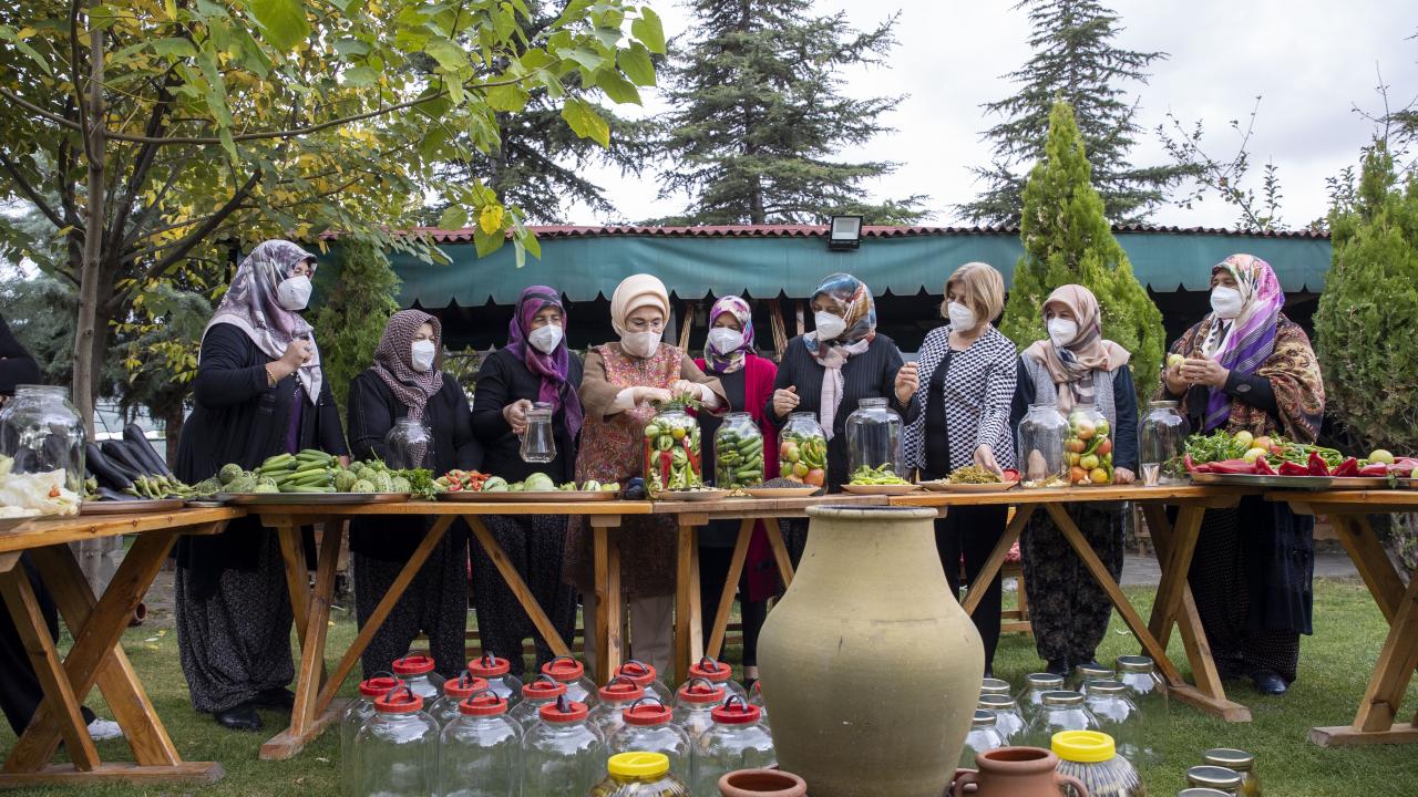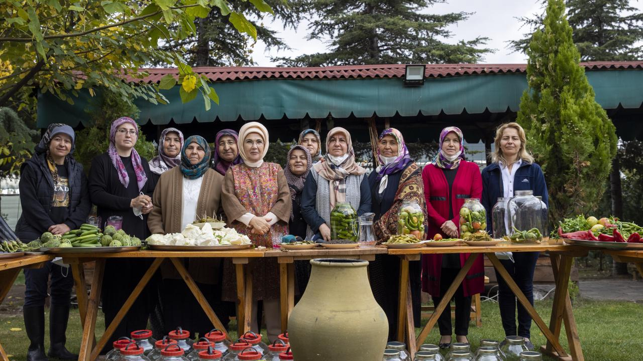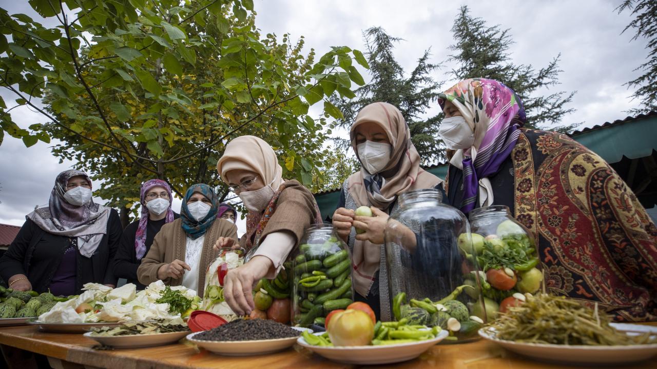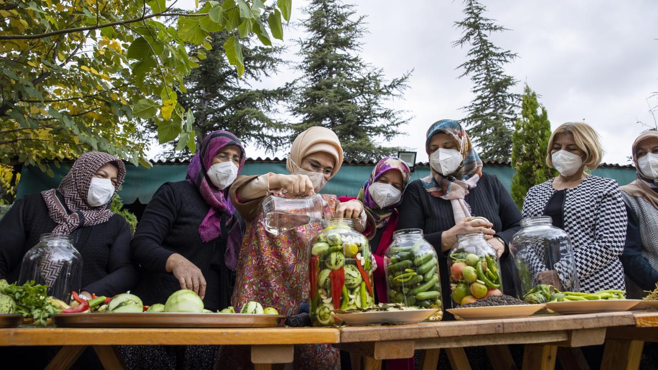 Cumhurbaşkanı Recep Tayyip Erdoğan'ın eşi Emine Erdoğan, Ankara'nın Çubuk ilçesine bağlı Aşağı Çavundur mahallesine gelerek, Çubuklu kadınların turşu kurma etkinliğine katıldı.