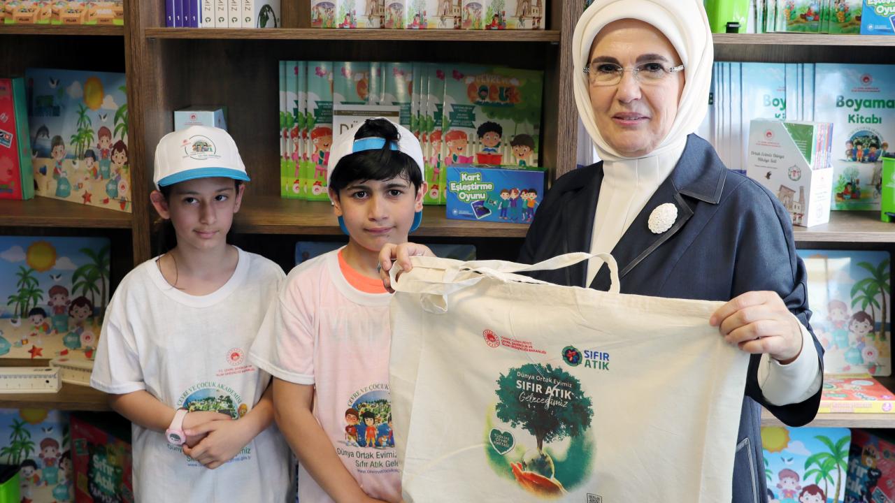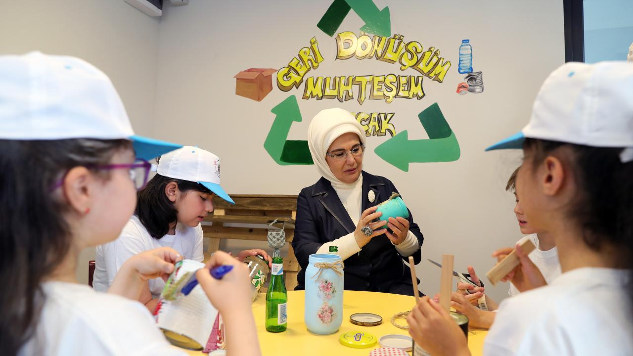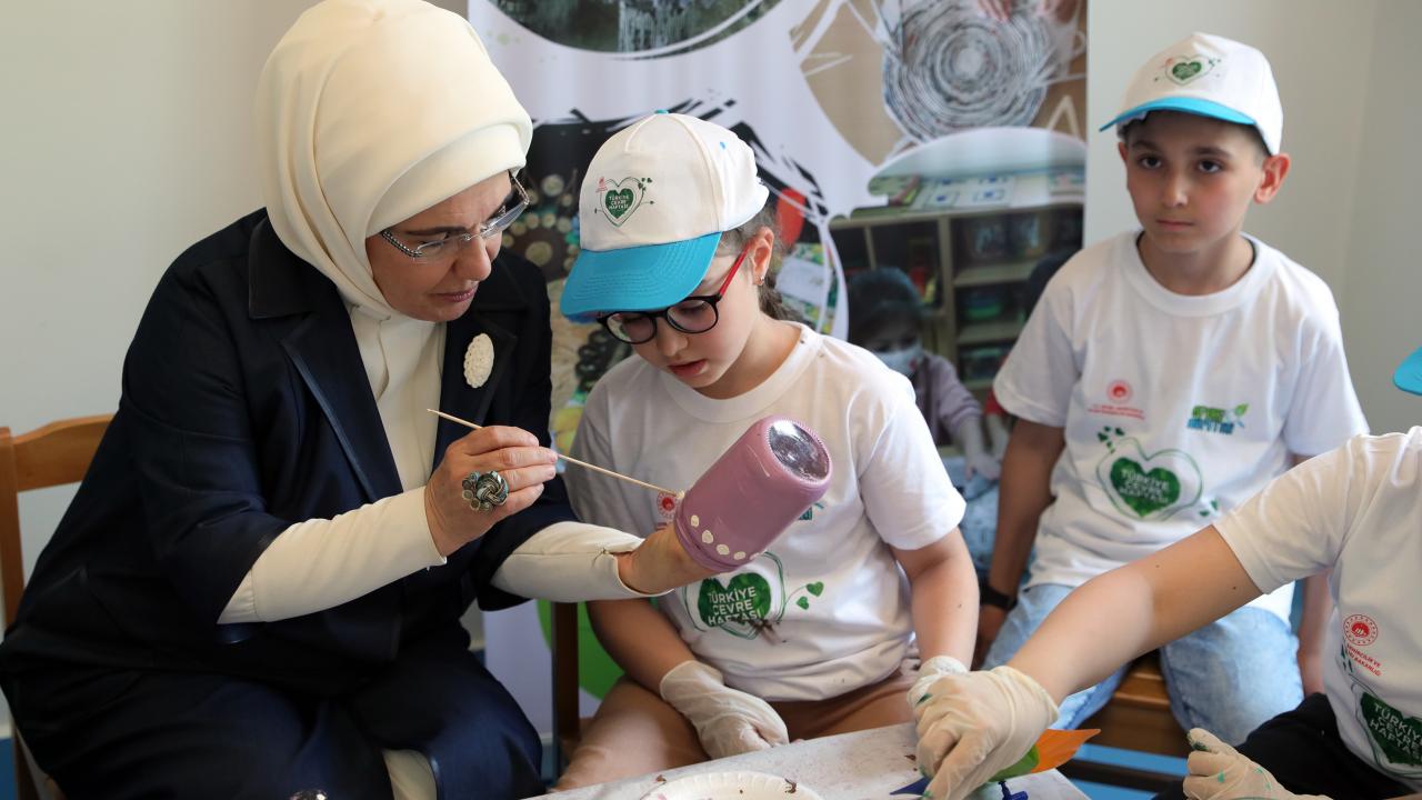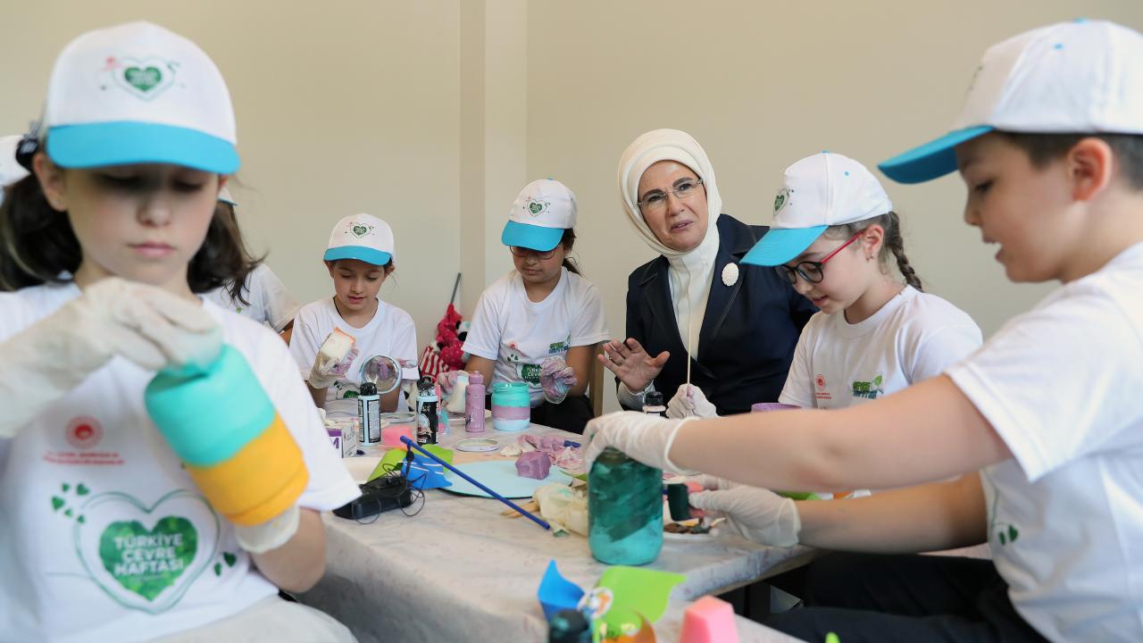 Atölyedeki çocuklarla kavanoz boyama etkinliğine katılan Emine Erdoğan, "Geleceği siz yönlendireceksiniz, daha az atık çıkaracaksınız" mesajını verdi. Erdoğan`a, kağıdın geri dönüşümüyle yapılan bebek hediye edildi.