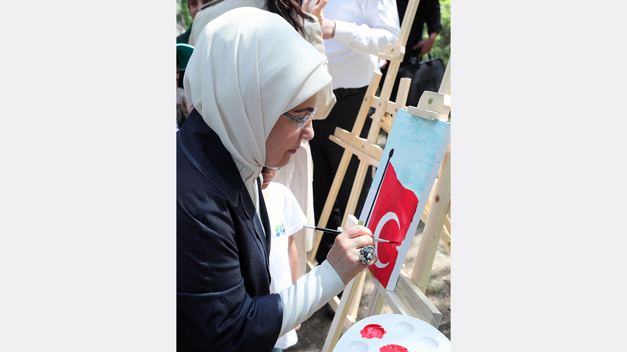 Cemre Çevre Hareketi`nin 81 il tablosunda yer alan Türk bayrağı resmini de boyayan Emine Erdoğan, üzerine imzasını attığı son parçayı ekleyerek, tabloyu tamamladı.