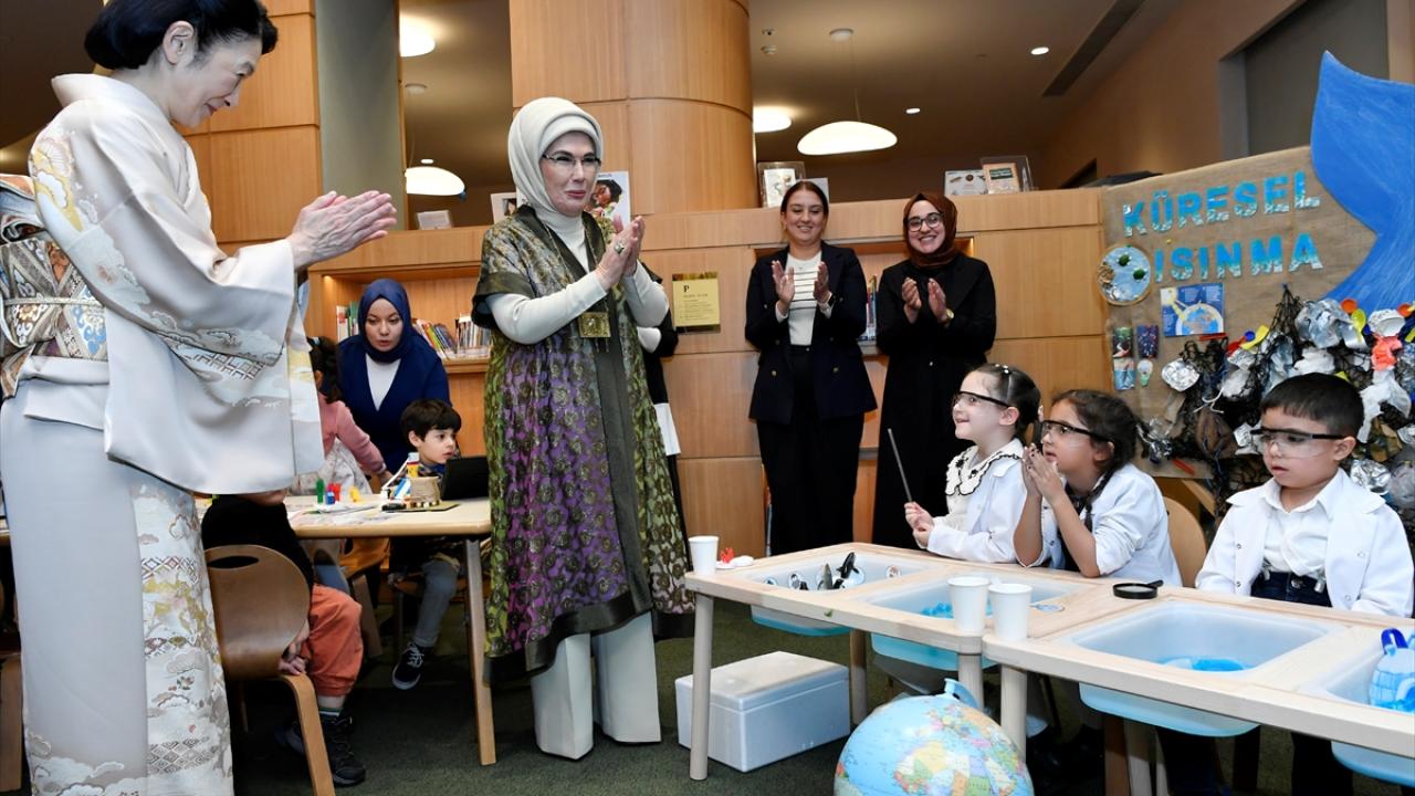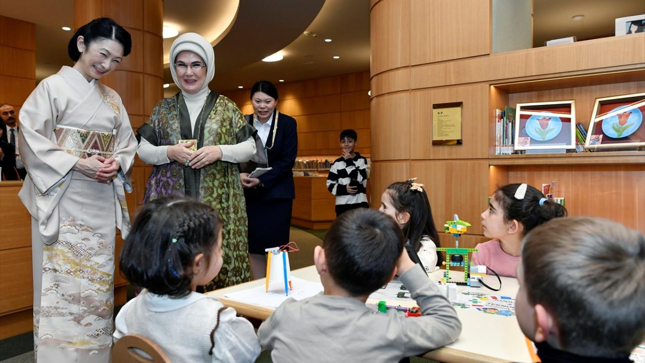 Daha sonra Nasreddin Hoca Kütüphanesi`ne geçen Emine Erdoğan ve Akishino`yu çocuklar sevgiyle karşıladı. Burada çocukların yaptığı resimleri inceleyen lider eşlerine, bir anaokulu çocuğu kendi yaptığı üzerinde lale motifi olan tabağı hediye etti.