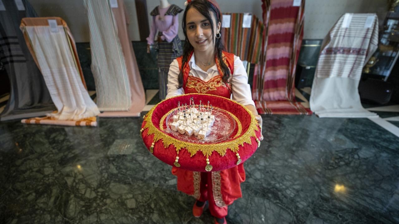 Sergide, kumda pişirilen Türk kahvesi ve lokum, yöresel kıyafetli personel tarafından davetlilere ikram edildi.