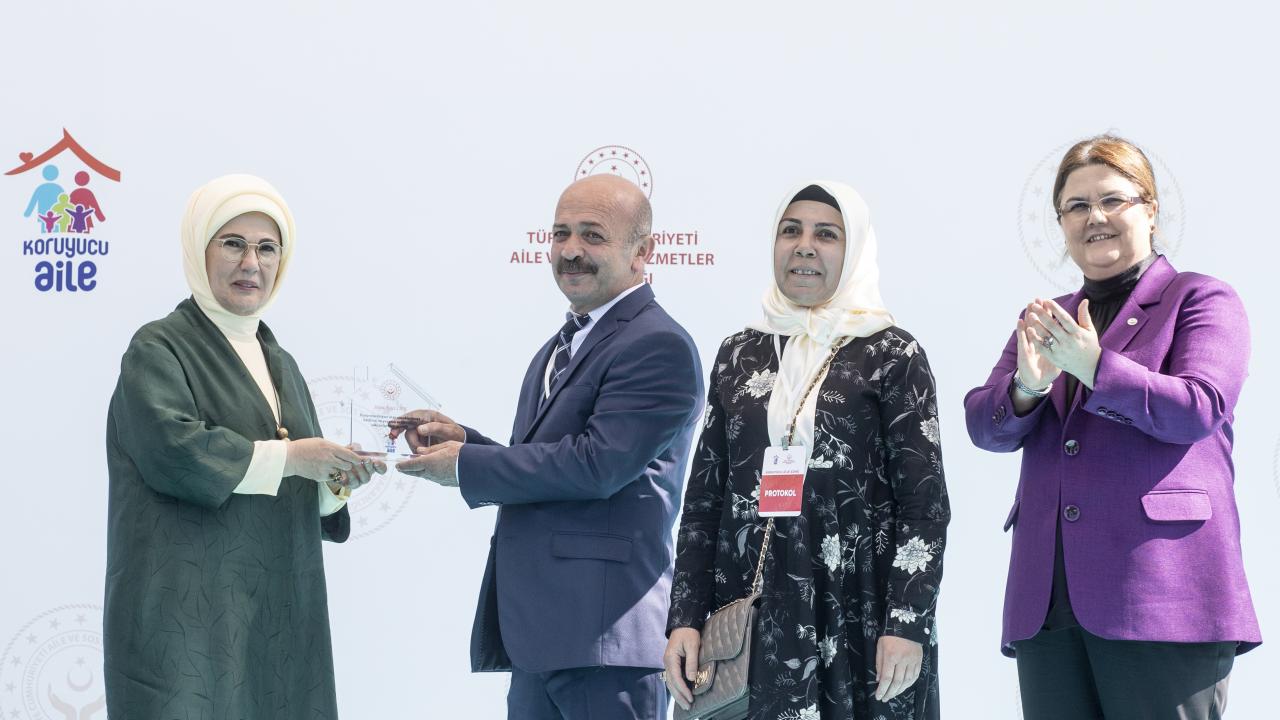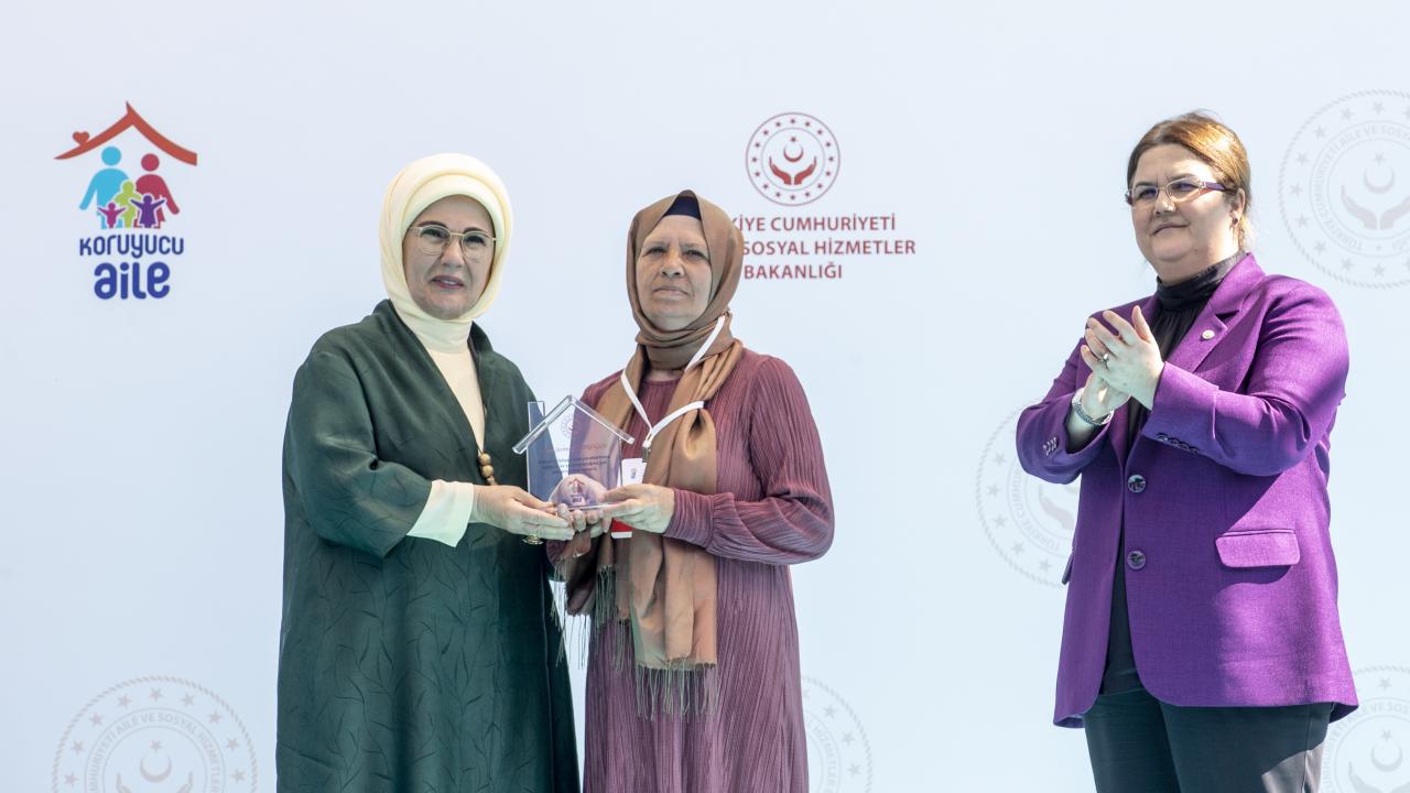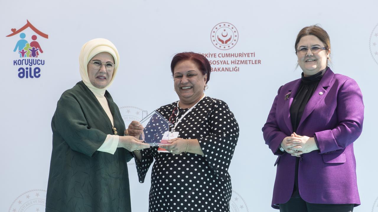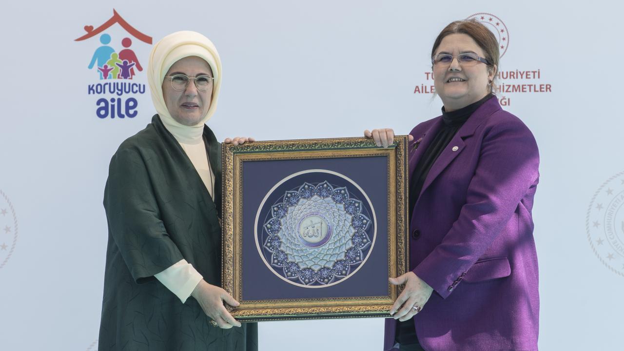 Konuşmaların ardından koruyucu ailelere plaket veren Emine Erdoğan`a Bakan Yanık tarafından Saray Çocuk Evleri`ndeki çocukların kağıt rölyef tekniğiyle yaptığı tablo hediye edildi.