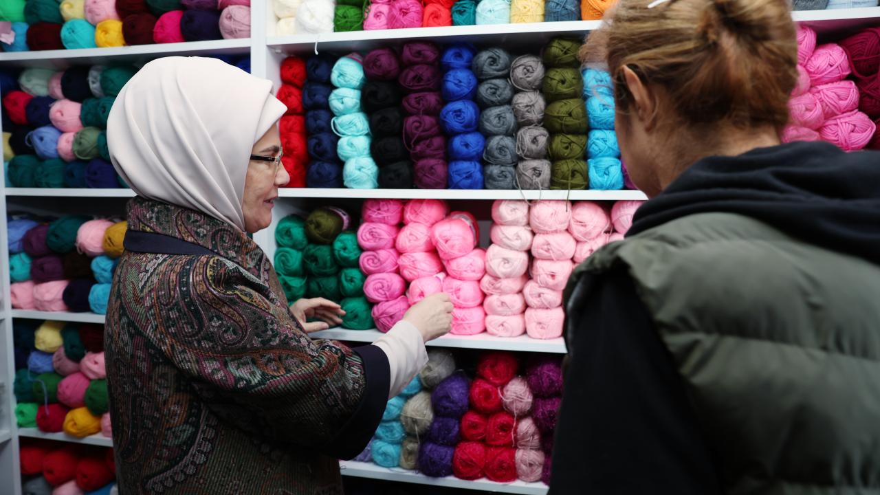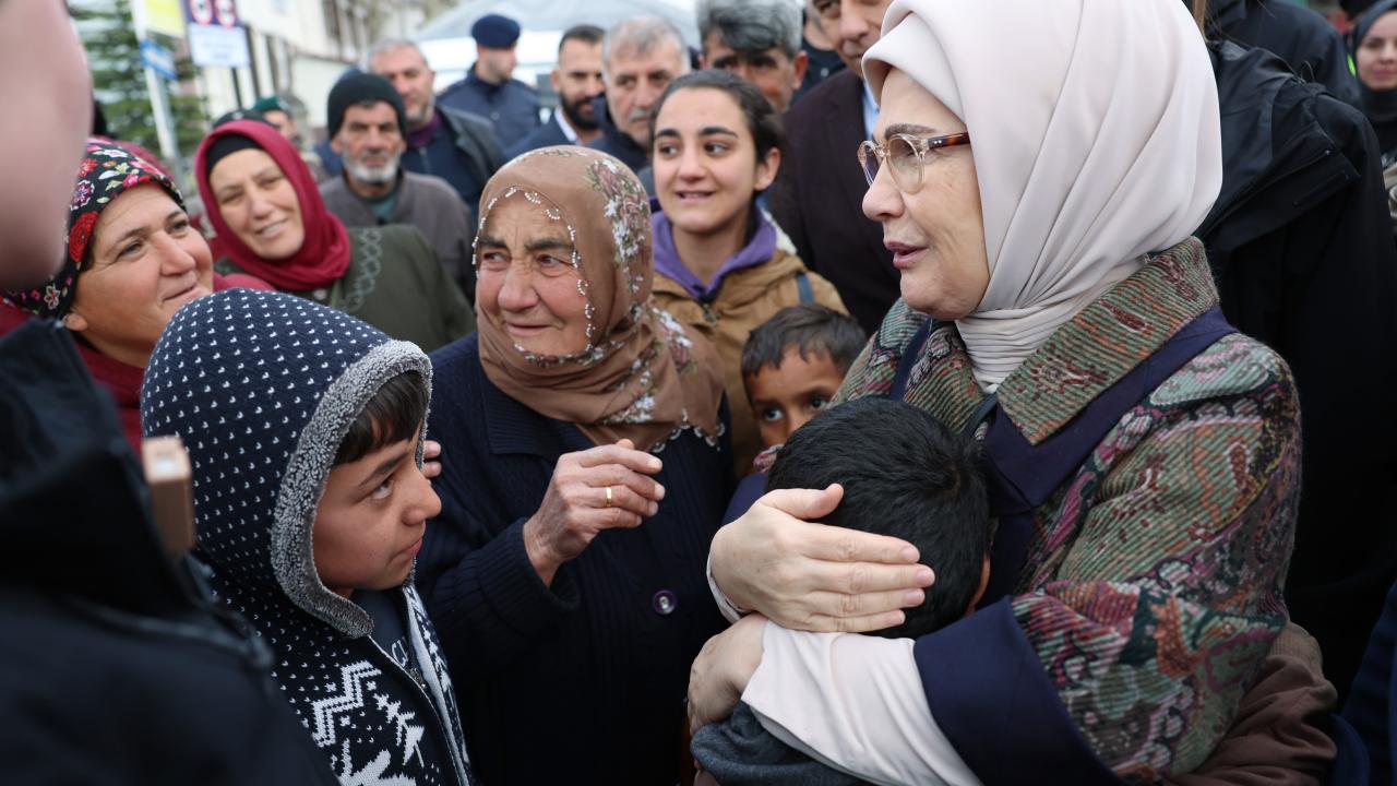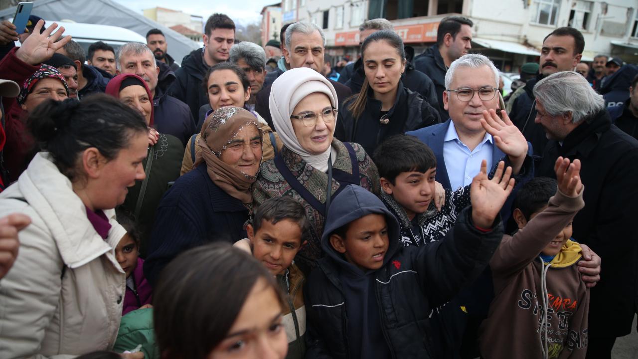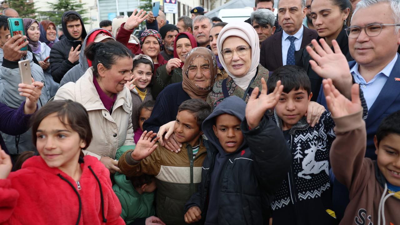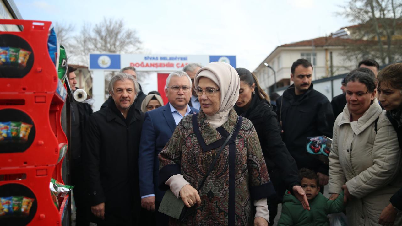 Emine Erdoğan, Sivas Belediyesince ilçede yaptırılan ve kasap, kuruyemiş, süt ürünleri, el örgüleri gibi ürünlerin pazarlandığı "Doğanşehir Esnaf Çarşısı" önünde depremzedelerle görüştü.