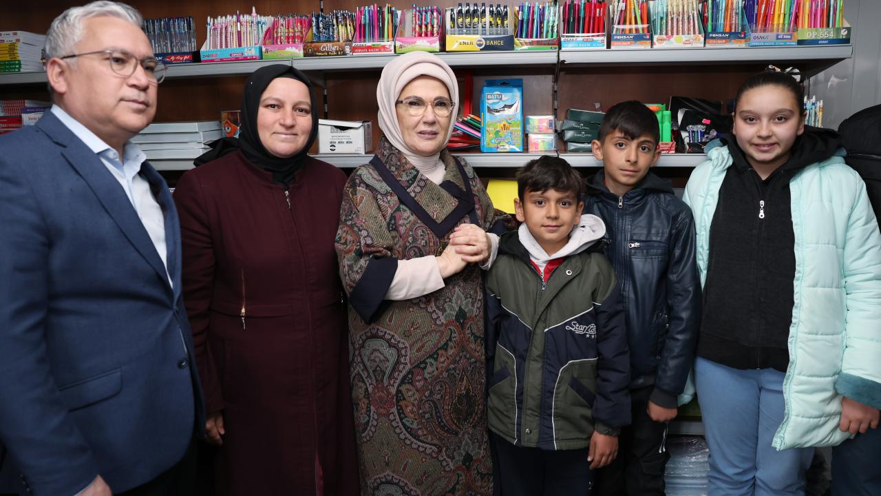 Emine Erdoğan, daha sonra konteyner çarşıdaki esnafın iş yerlerini ziyaret ederek, depremzede esnafa hayırlı işler diledi.