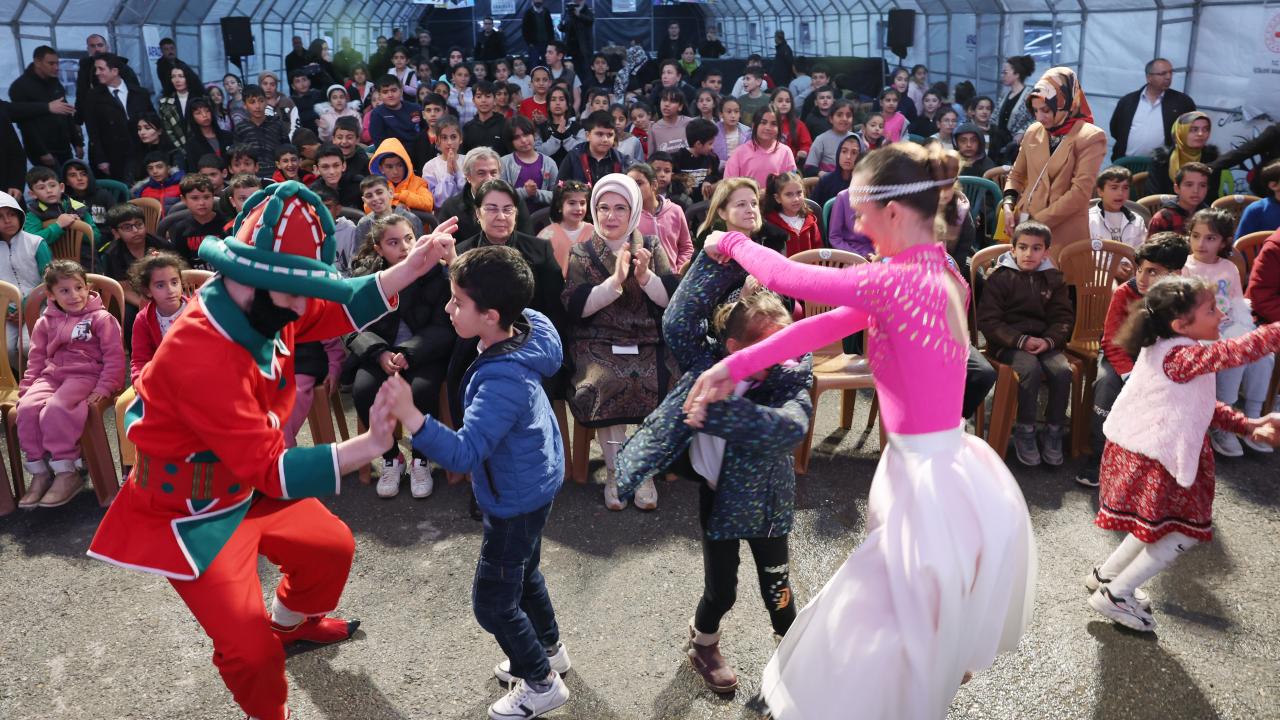 Kültür ve Turizm Bakanlığının kurduğu çadırda çocuklarla sergilenen gösteriyi izleyen Erdoğan, onlarla sohbet edip hatıra fotoğrafı çektirdi.