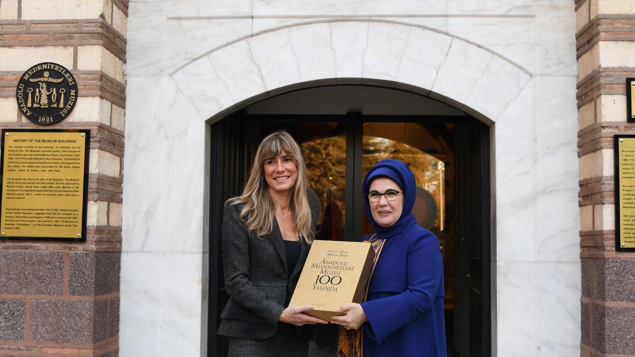 Ziyaretin ardından, iki lider eşine müzenin yüzüncü yılına özel kitap ve Hitit Güneş Kursu paketi takdim edildi.