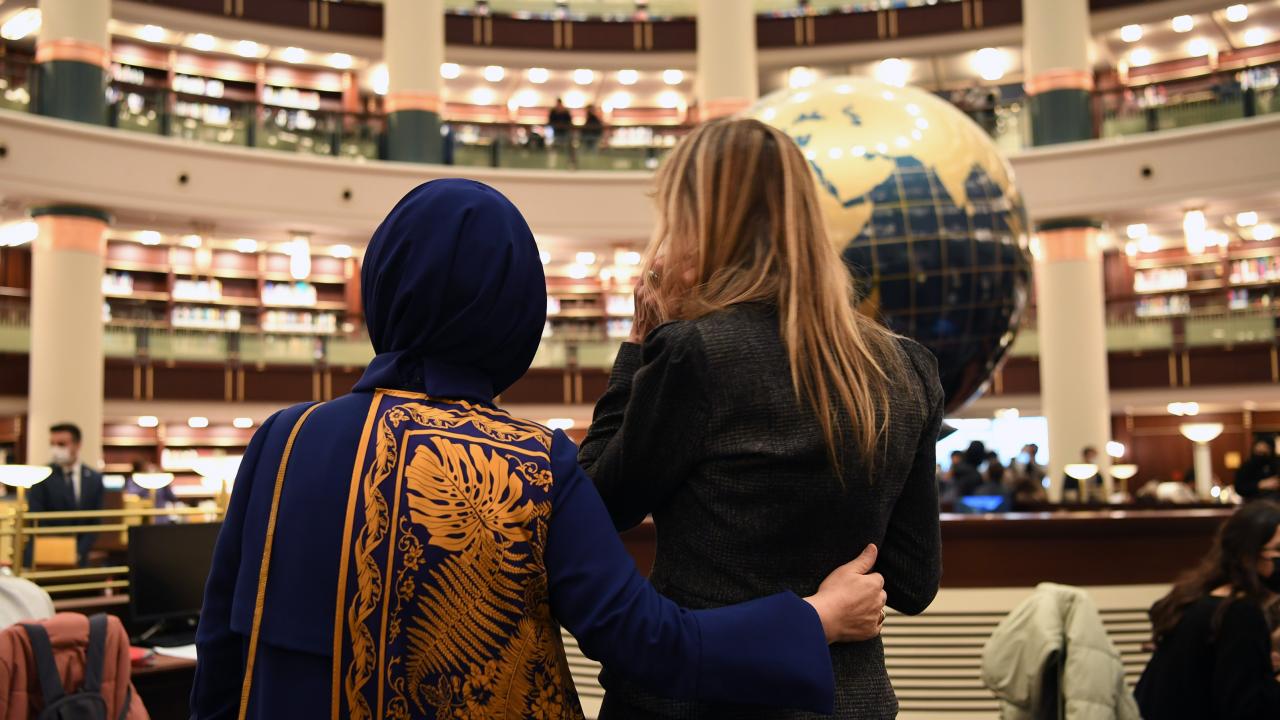 Cumhurbaşkanlığı Millet Kütüphanesi`ne geçen Emine Erdoğan ve konuğu Fernandez, Cihannüma salonundaki İspanya kitaplığı bölümünde bulunan kitaplarla ilgili bilgi verildi.