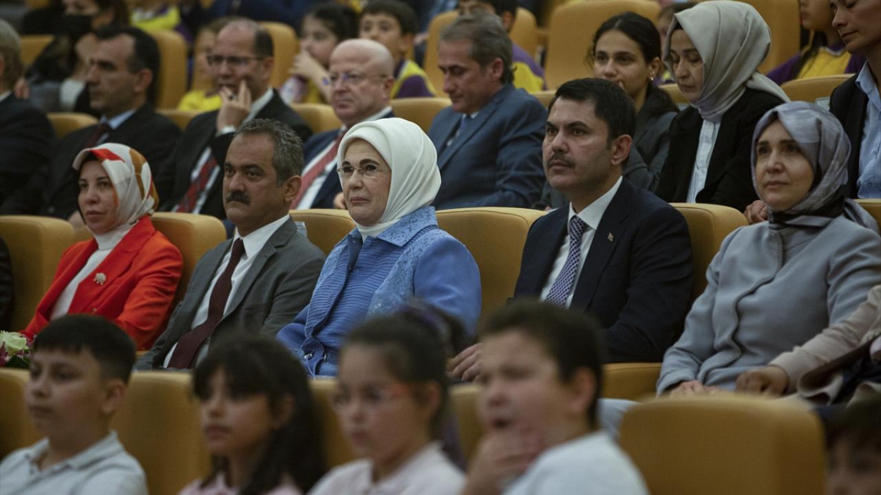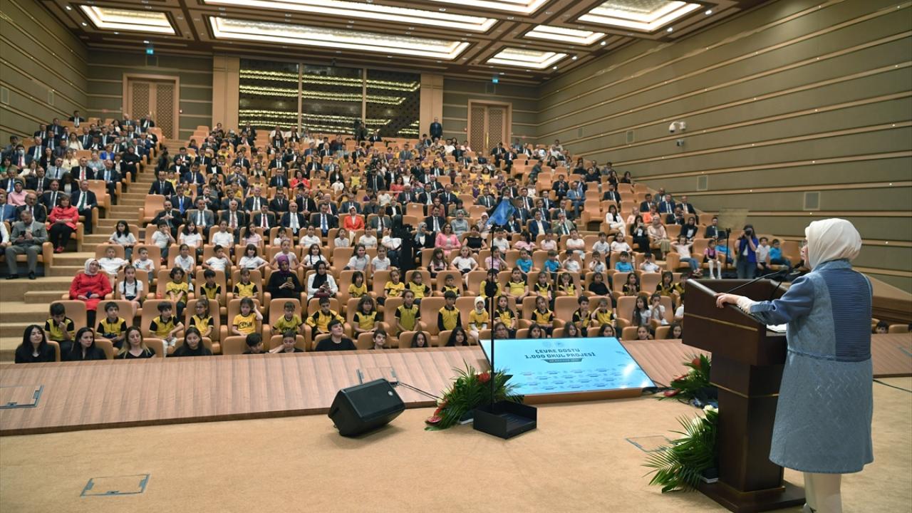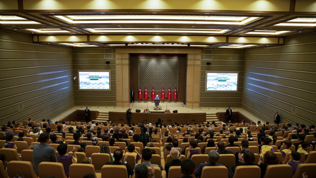 Cumhurbaşkanı Recep Tayyip Erdoğan'ın eşi Emine Erdoğan, Cumhurbaşkanlığı Külliyesi'nde düzenlenen "Çevre Dostu 1000 Okul Projesi Ödül Töreni'ne katıldı.