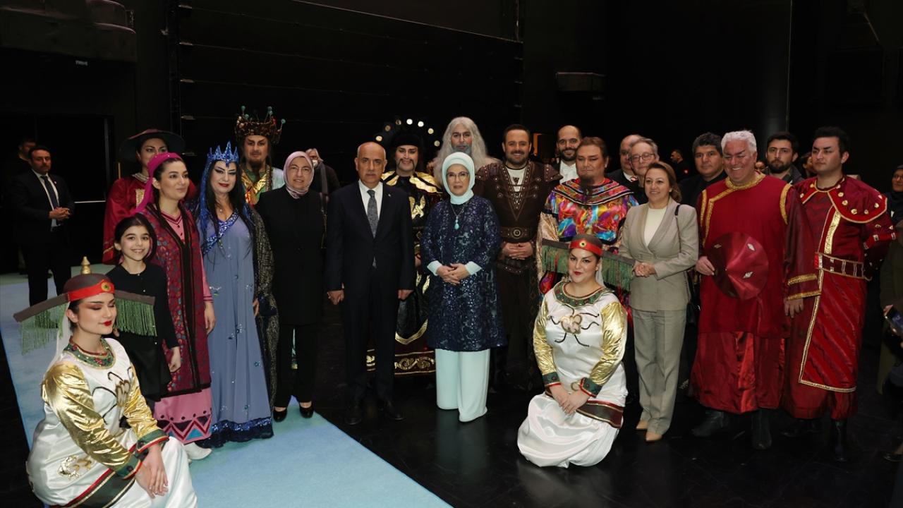 Opera gösterisi sonrası sahnenin arka kısmına geçen Emine Erdoğan, sanatçıları kutladı. Sanatçılarla hatıra fotoğrafı çektiren Erdoğan, Murat Karahan ile sohbet etti.