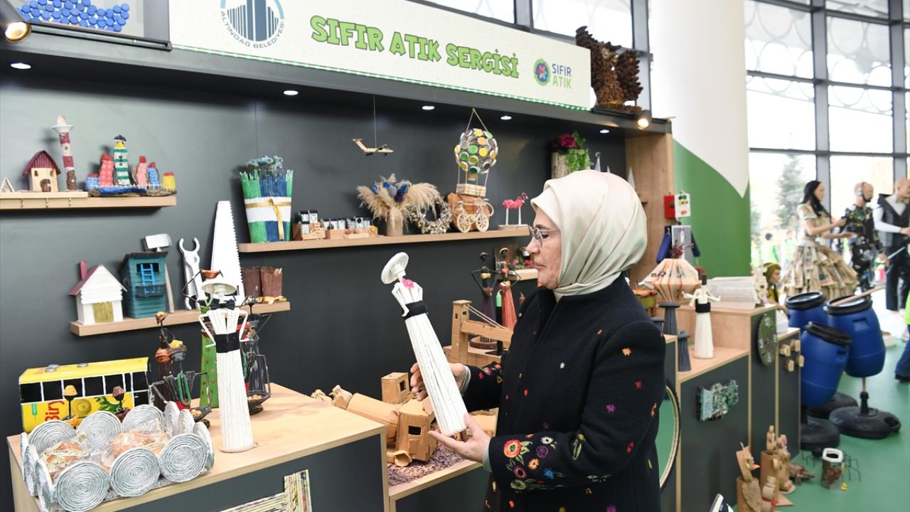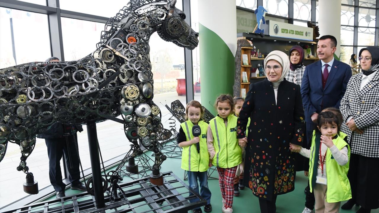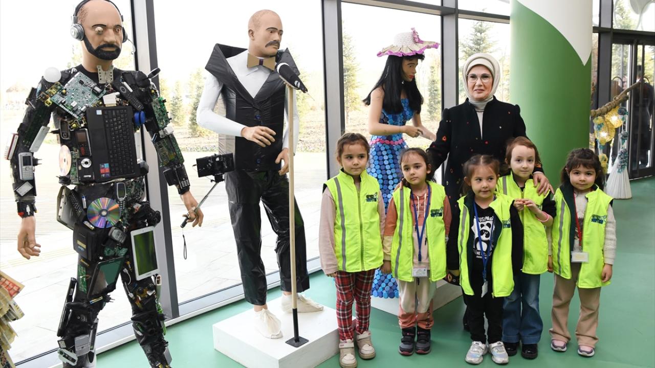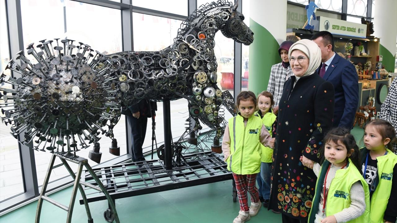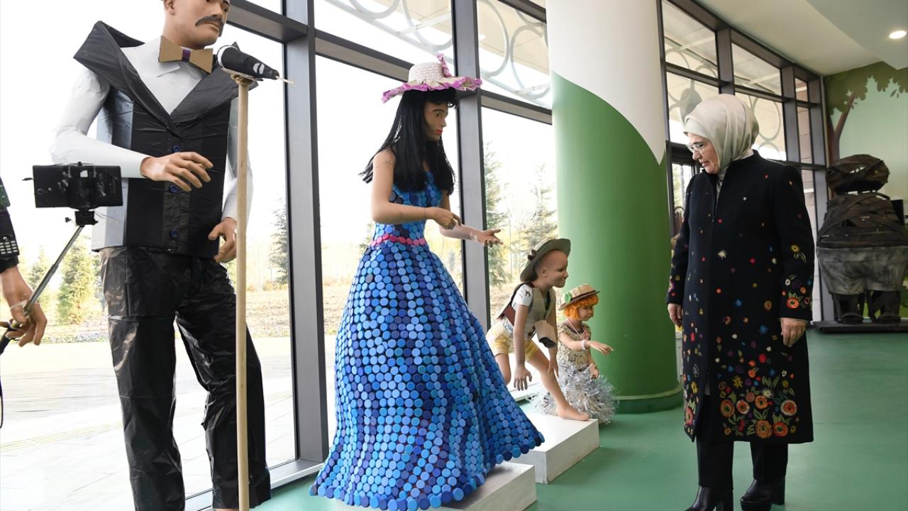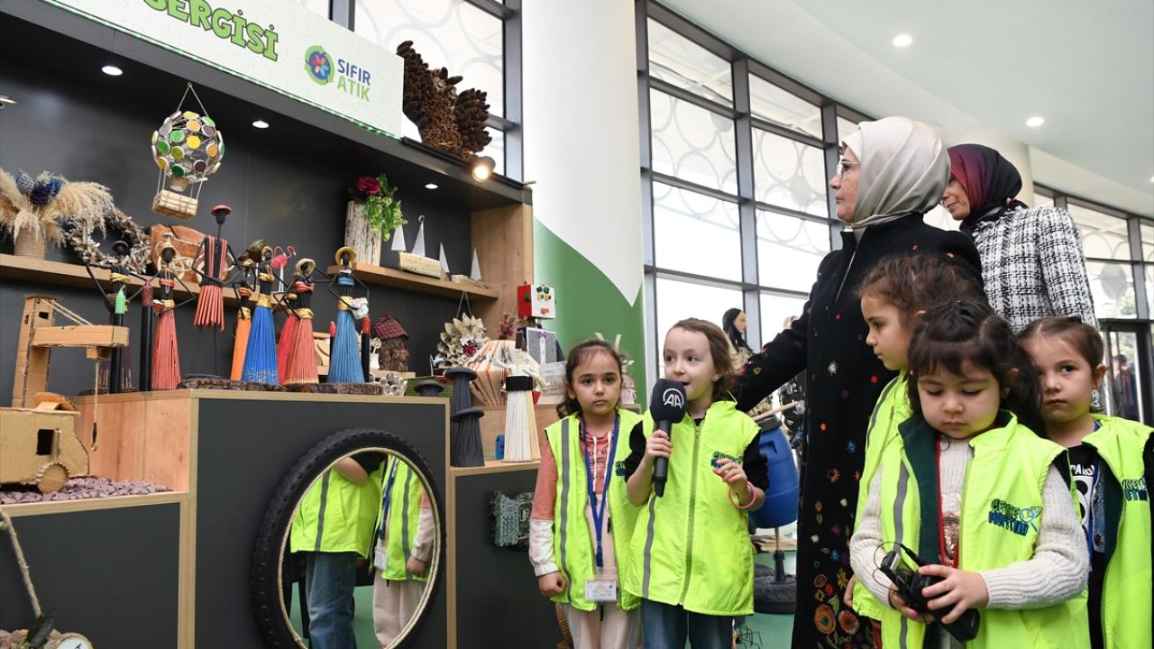 Küçük Reyyan, Emine Erdoğan`ın isteği üzerine burada atıklardan yapılan ürünleri tek tek anlattı. Erdoğan, diğer çocuklara da söz verdi.