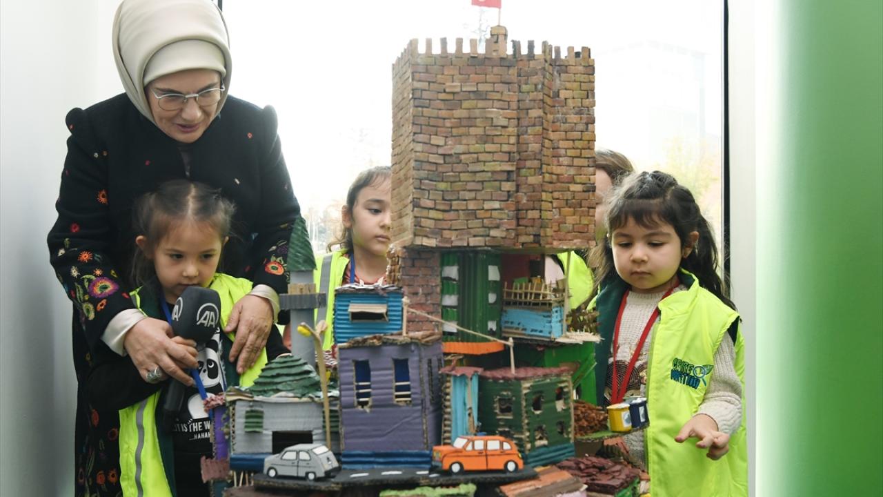 Merkezdeki atölye çalışmaları kapsamında atık karton ve kozalaklardan flamingo maketi yapan çocukları izleyen ve onlarla sohbet eden Emine Erdoğan, "Tebrik ediyorum çocuklar hepinizi, harika şeyler yapmışsınız." dedi.