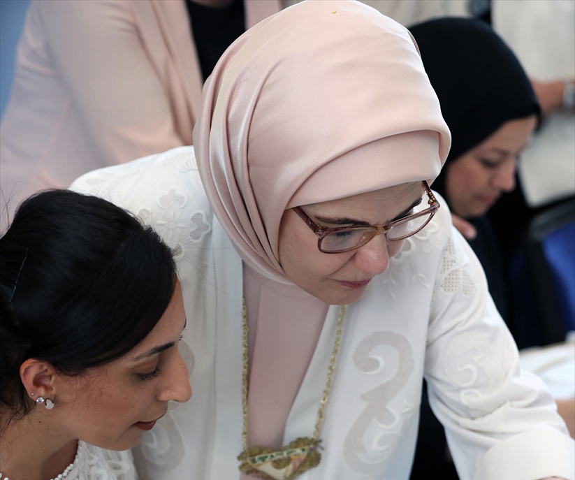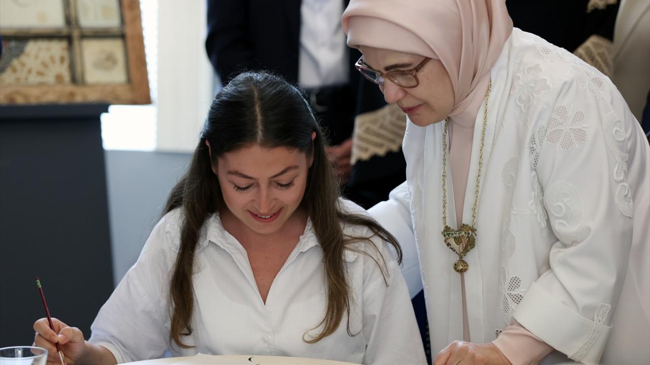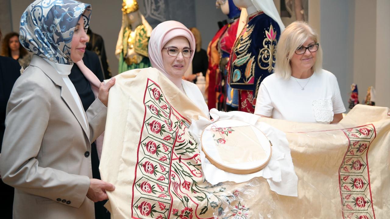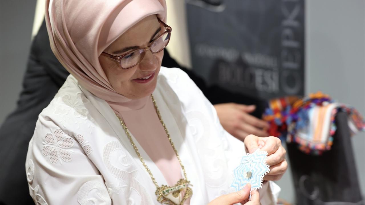 Erdoğan ve beraberindekiler dantel geri dönüşüm atölyesini gezdikten sonra "Anadolu Cepkenleri" sergisi ile nakış, minyatür ve iğne oyası uygulama alanlarını ziyaret etti.