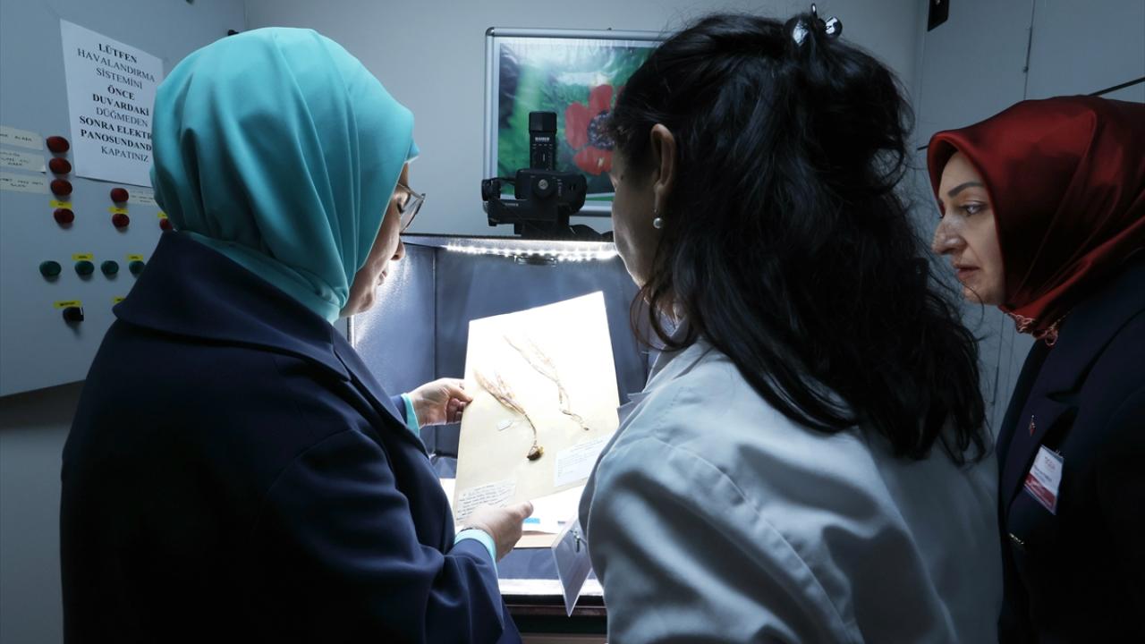 Gen bankasının önemli bitki alanlarını ve tohum standını ziyaret eden Erdoğan`a, Enstitü Müdürü Dr. Hümeyra Yaman tarafından gen bankasının çalışmaları hakkında bilgi verildi. Buradaki incelemelerinin ardından herbaryum odasına geçen Emine Erdoğan, kurutulmuş bitkilerden herbaryum yaptı.