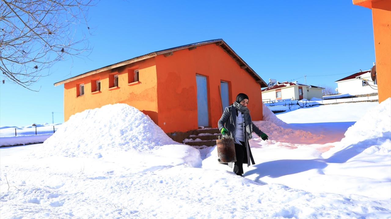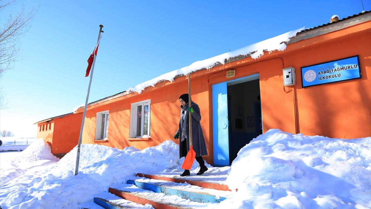 Yılmaz, gündüz saatlerinde sıcaklığın sıfırın altında 15`lere kadar düştüğü köyde, sobayı yakmak için 1 metre seviyesini aşan karda yürüyerek odunları kovayla sınıfa taşıyor.