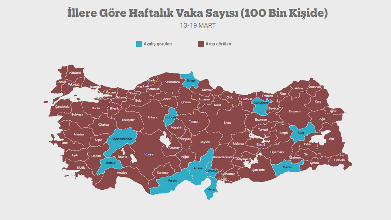 Sağlık Bakanlığı, 81 il için 13-19 Mart'ta 100 bin kişide görülen koronavirüs vaka sayılarını açıkladı. Verilere göre en çok artışın ve azalışın olduğu 10 şehir...
