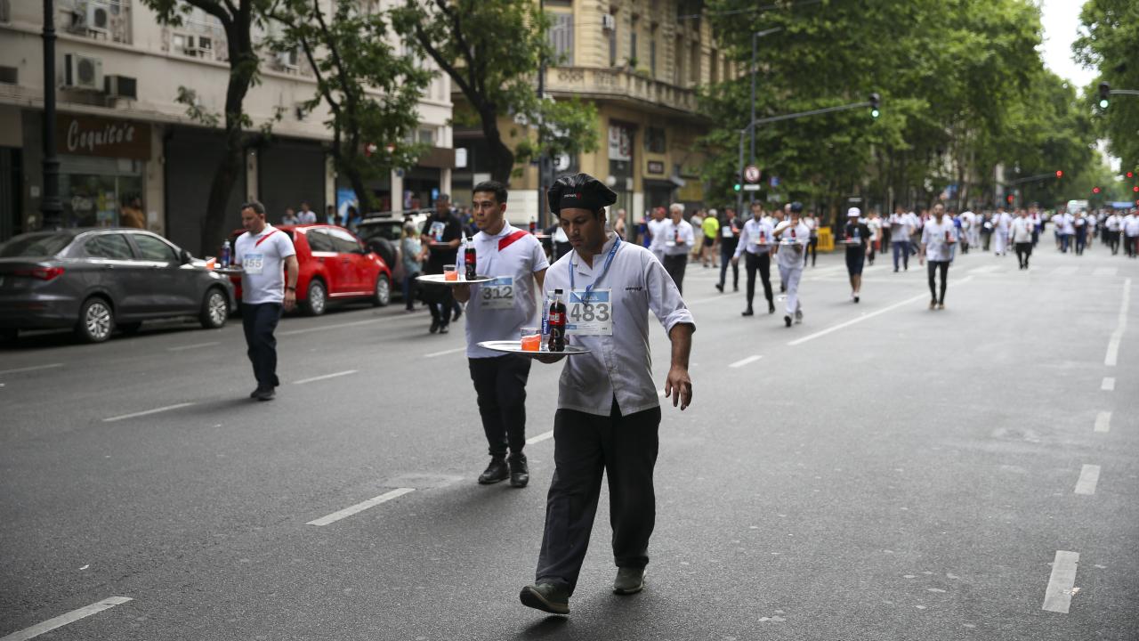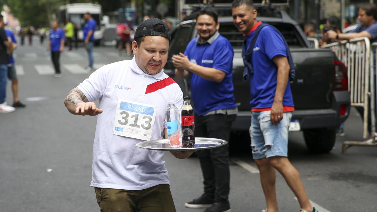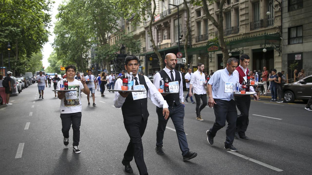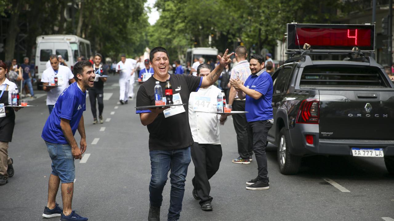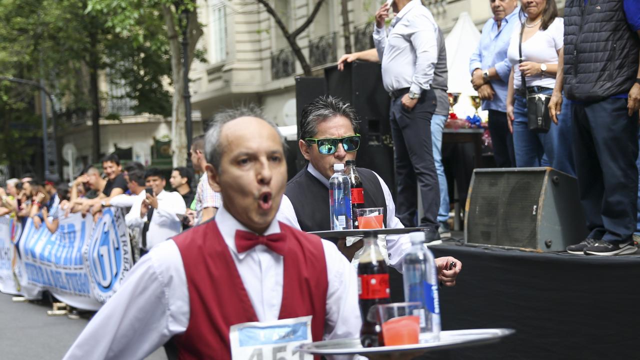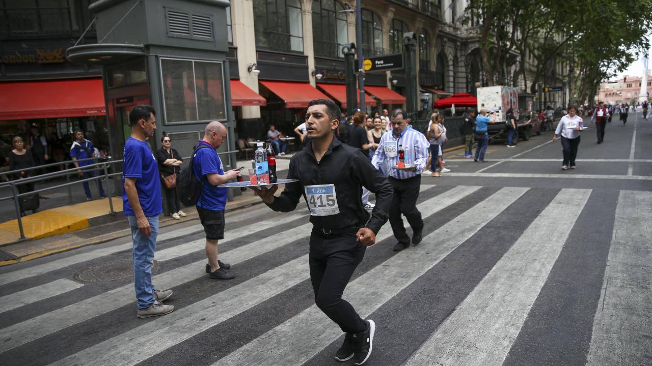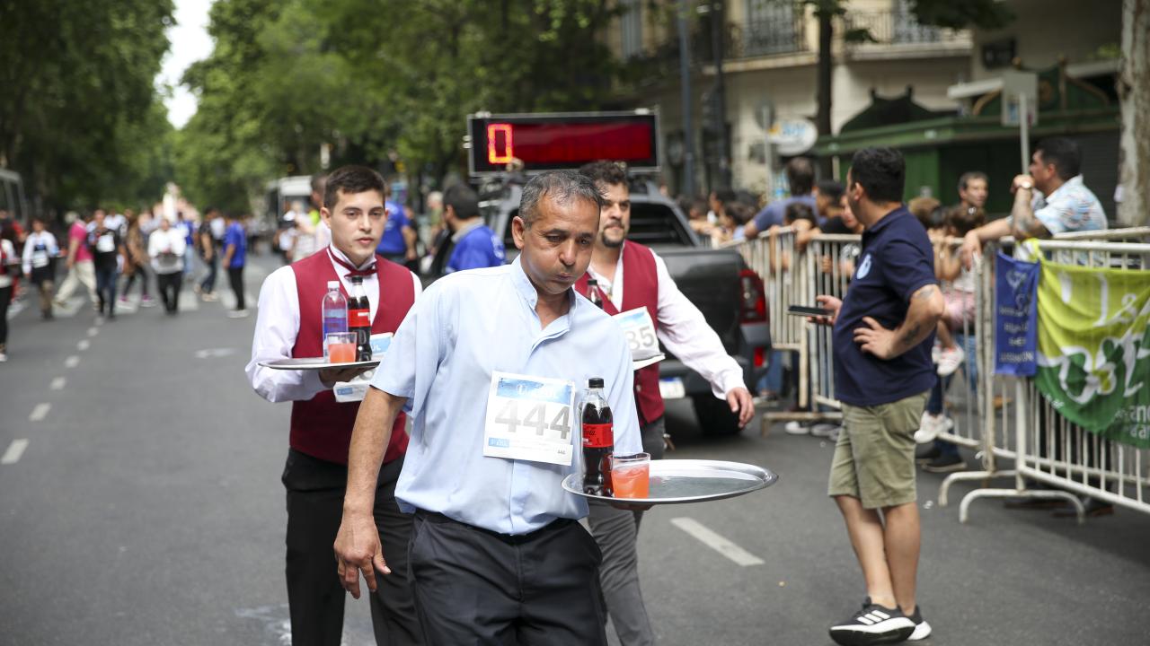 Arjantin'in başkenti Buenos Aires'te garsonlar, ellerinde tepsileriyle en hızlı çalışan olmak için ter döktü.