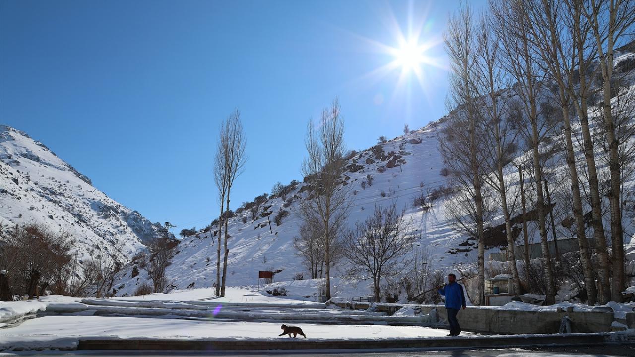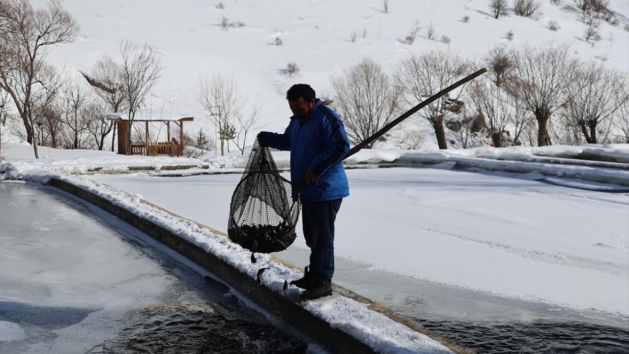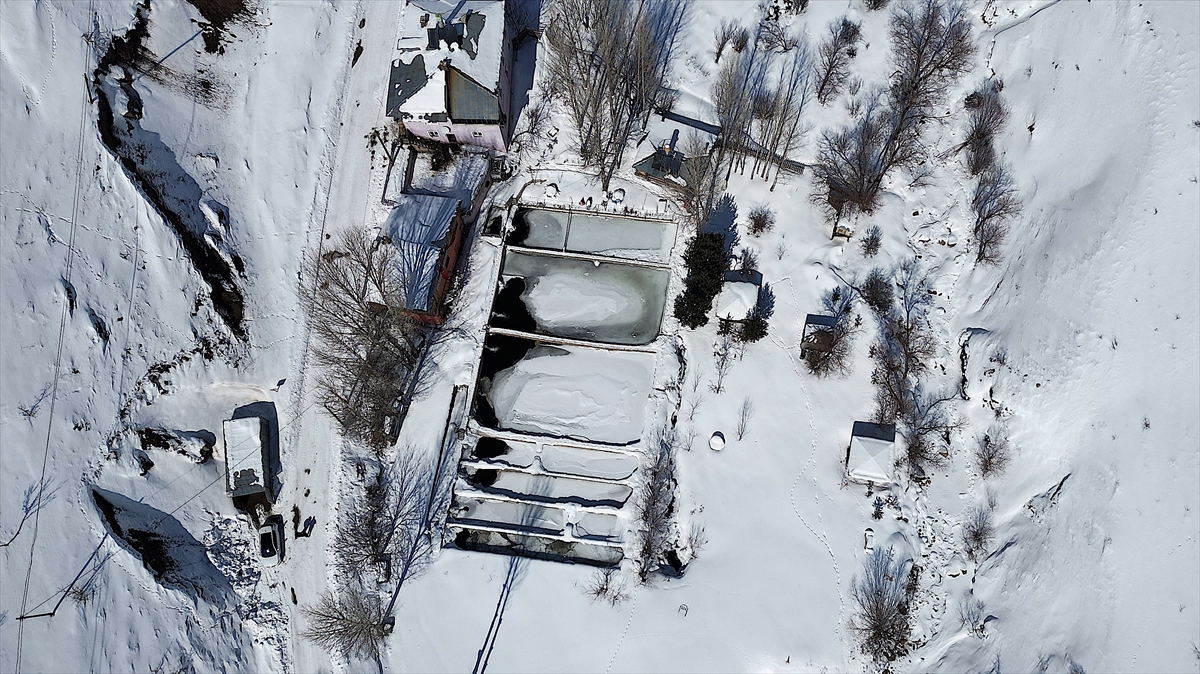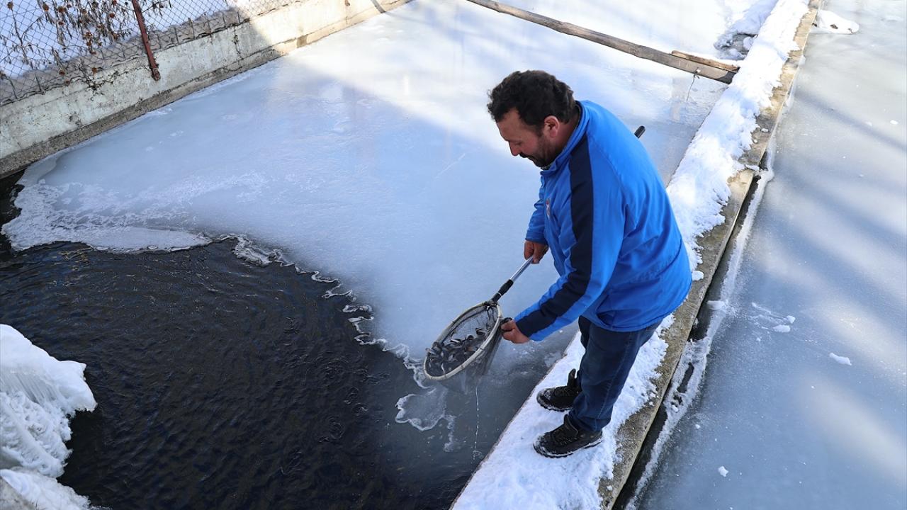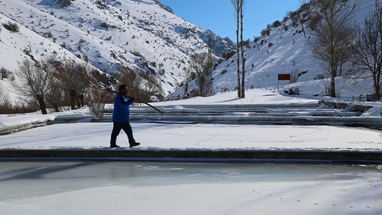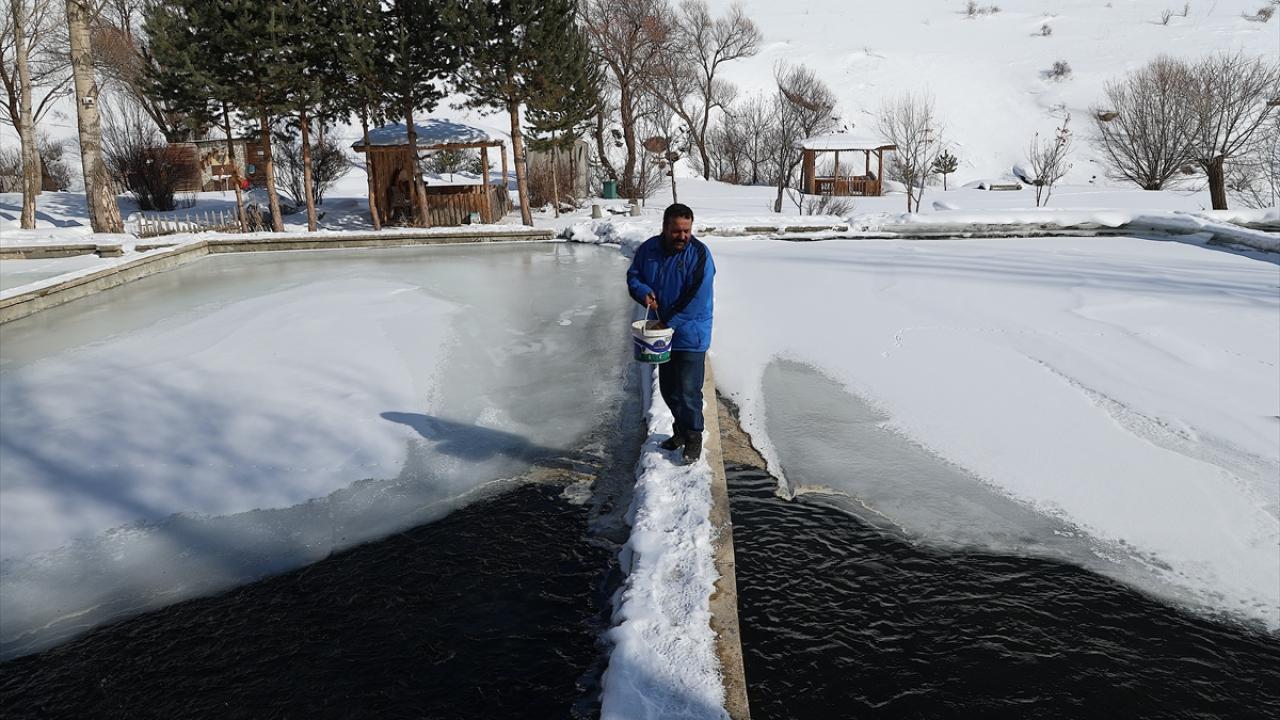Kent merkezine 60 kilometre uzaklıkta, dağların çevrelediği 2 bin rakımlı Yoncalı köyündeki kültür alabalığı üretim tesisine ait havuzlarda da buz kalınlığı 10 santimetreyi buluyor.