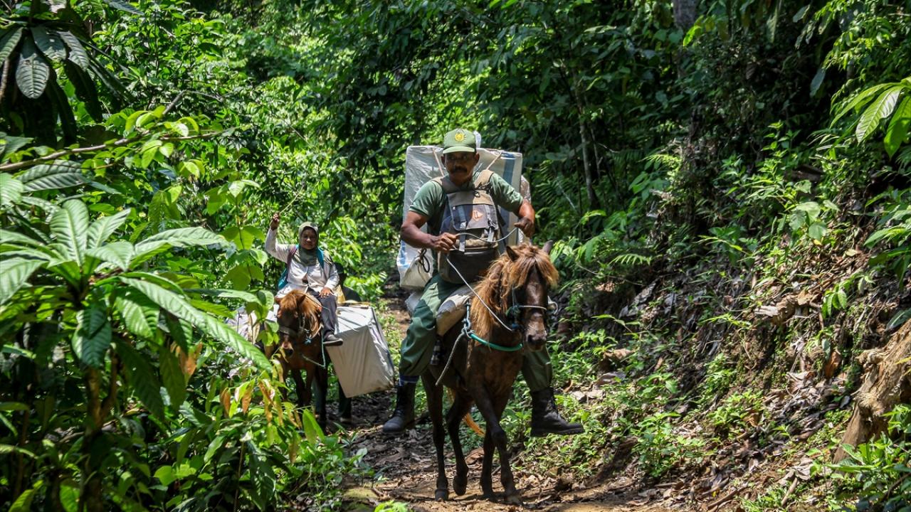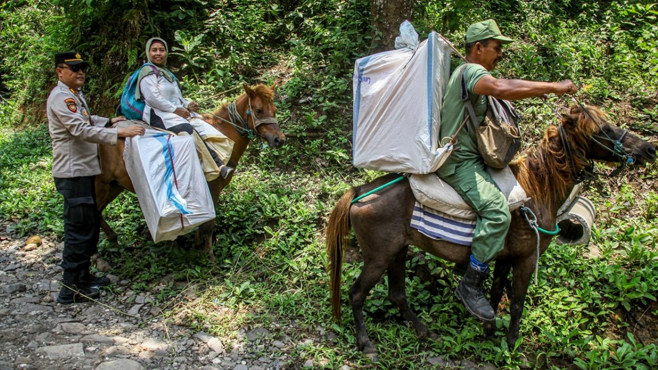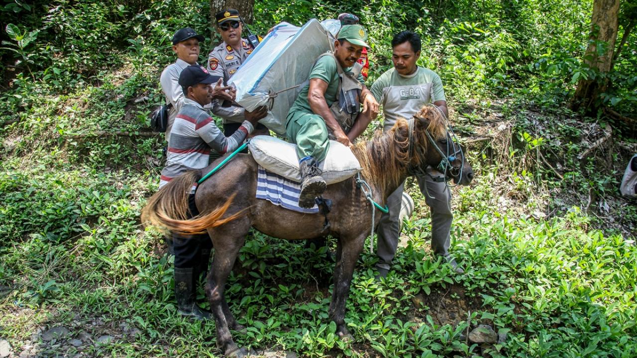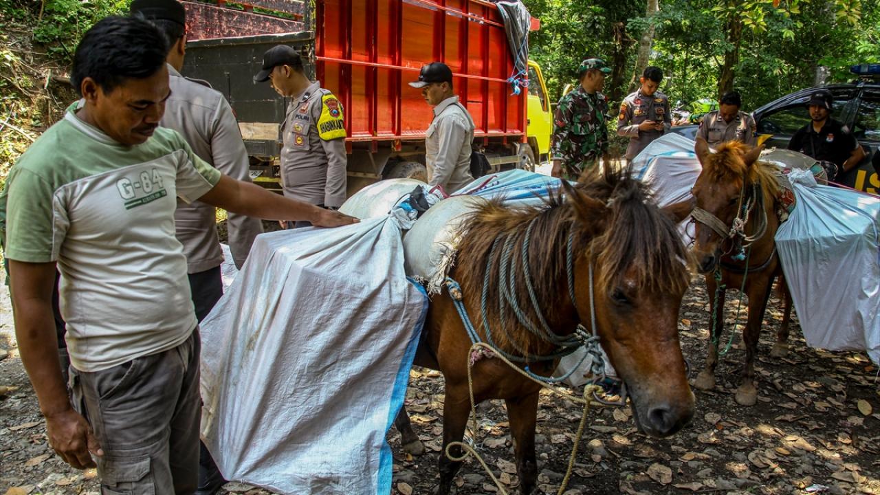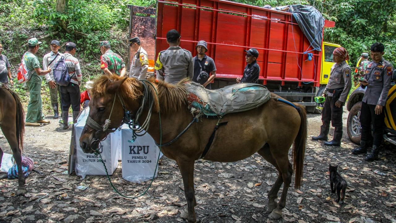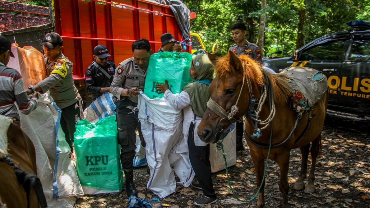 Sandık görevlileri, Doğu Java'nın Jember kentine bağlı Andongrejo Köyü'ndeki ücra bir bölgede Endonezya Genel Seçimleri için gerekli olan oy pusulaları ve diğer ekipmanların lojistiğini sağlamak için atları kullanıyor.