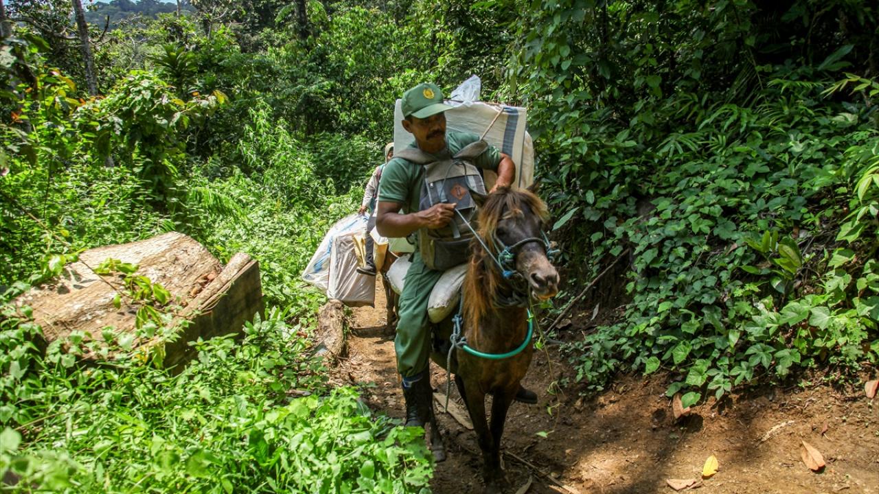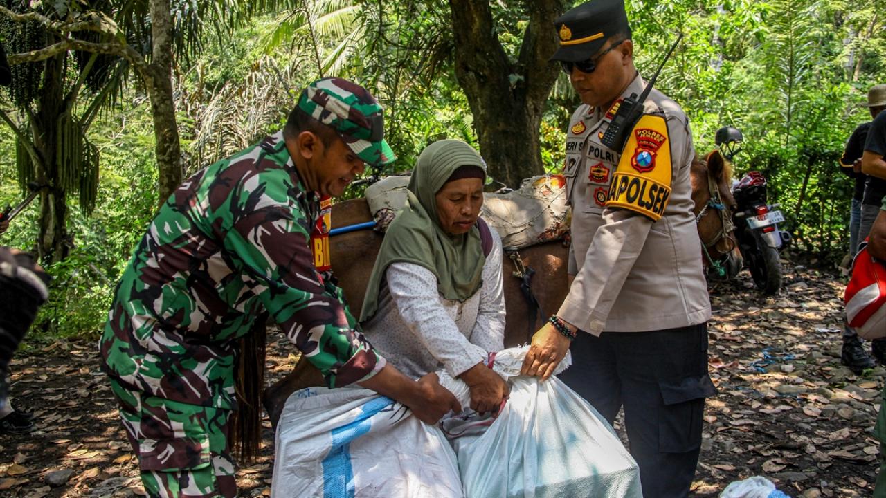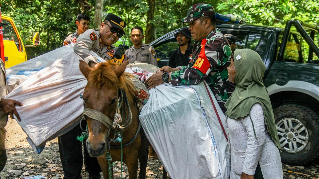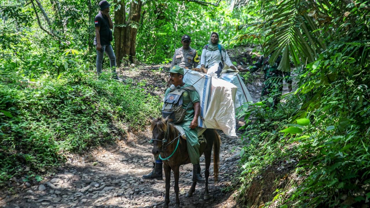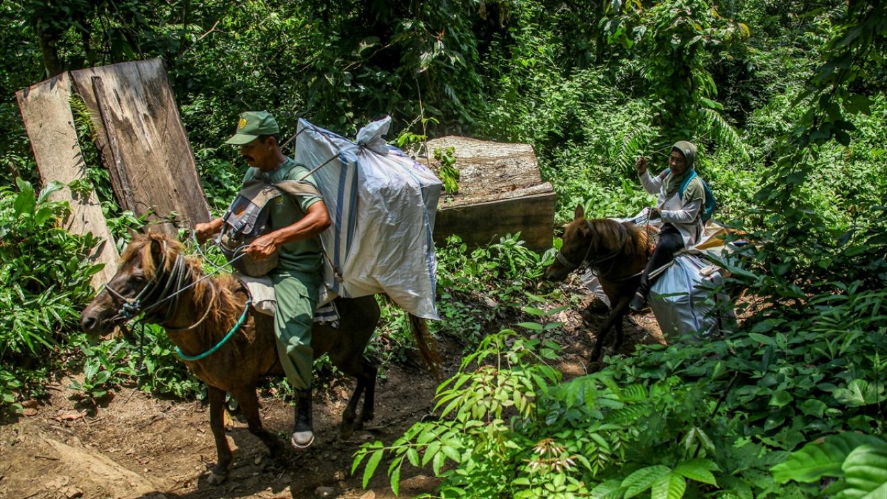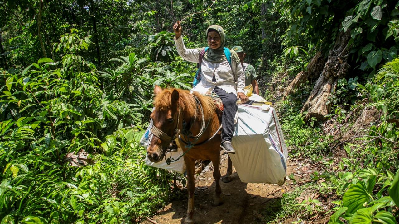 Sandık görevlileri, Doğu Java'nın Jember kentine bağlı Andongrejo Köyü'ndeki ücra bir bölgede Endonezya Genel Seçimleri için gerekli olan oy pusulaları ve diğer ekipmanların lojistiğini sağlamak için atları kullanıyor.