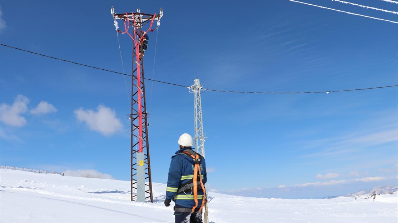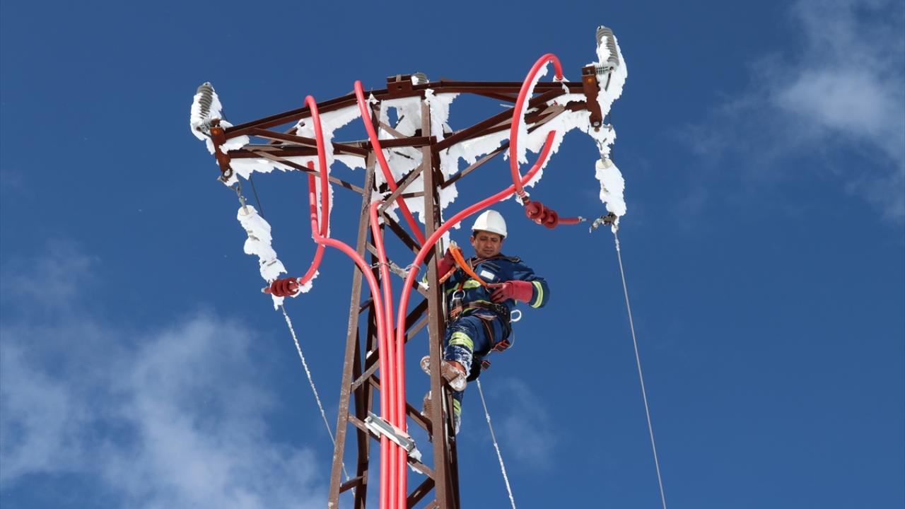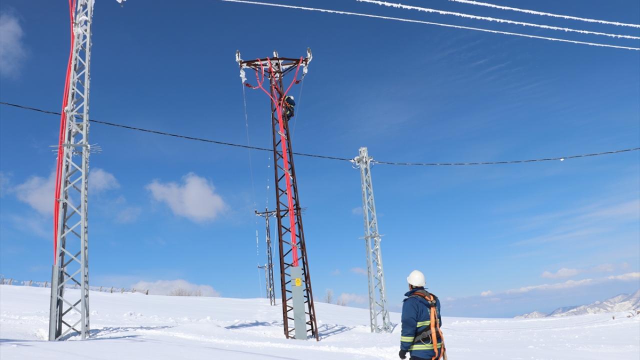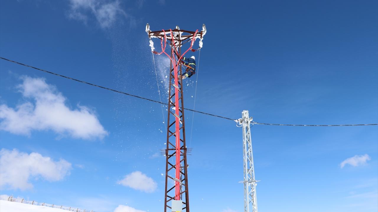Fırtına nedeniyle elektrik direklerinde oluşan buzlanmaları temizleyerek arızaları gideren enerji timleri, özverili çalışmaları sonucunda bölgede enerji akışını sağlıyor.