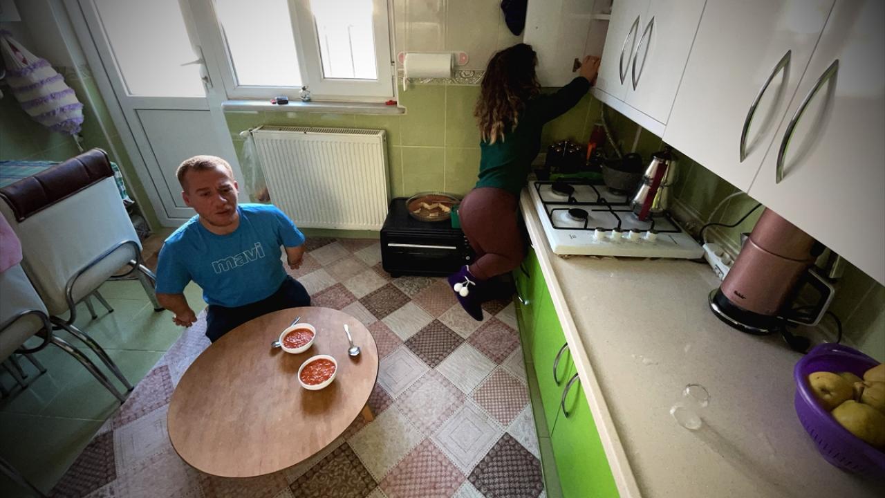 Mutfak tezgahı Bursa Büyükşehir Belediyesi tarafından boylarına göre yaptırılan çift, perde asmak gibi işlerde ise üst katlarında oturan akrabalarından destek alıyorlar, ev işlerinde birbirlerine yardımcı oluyorlar.