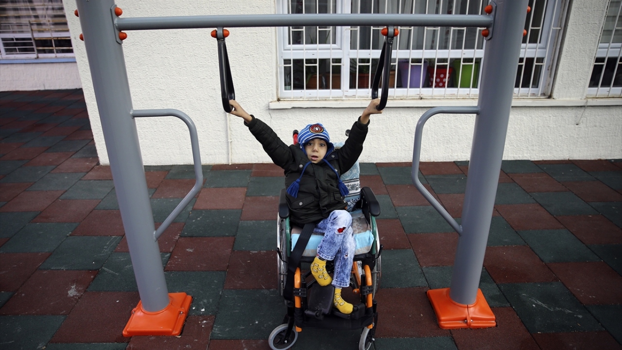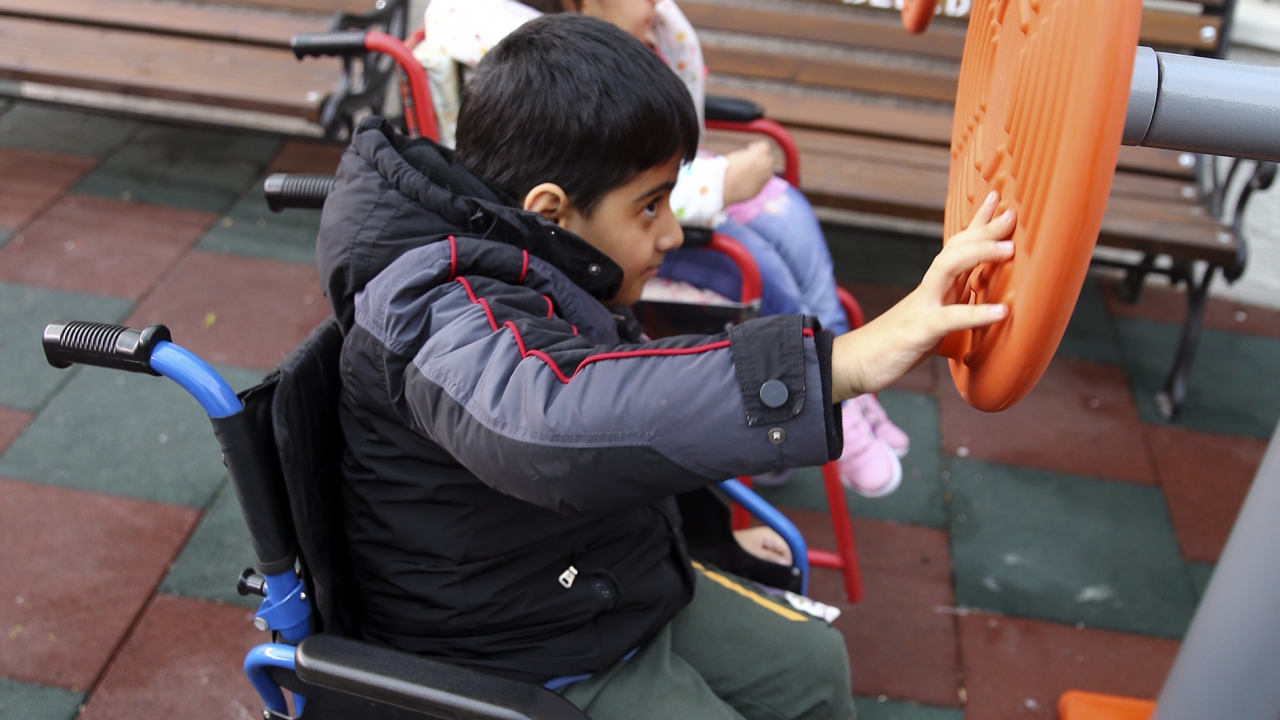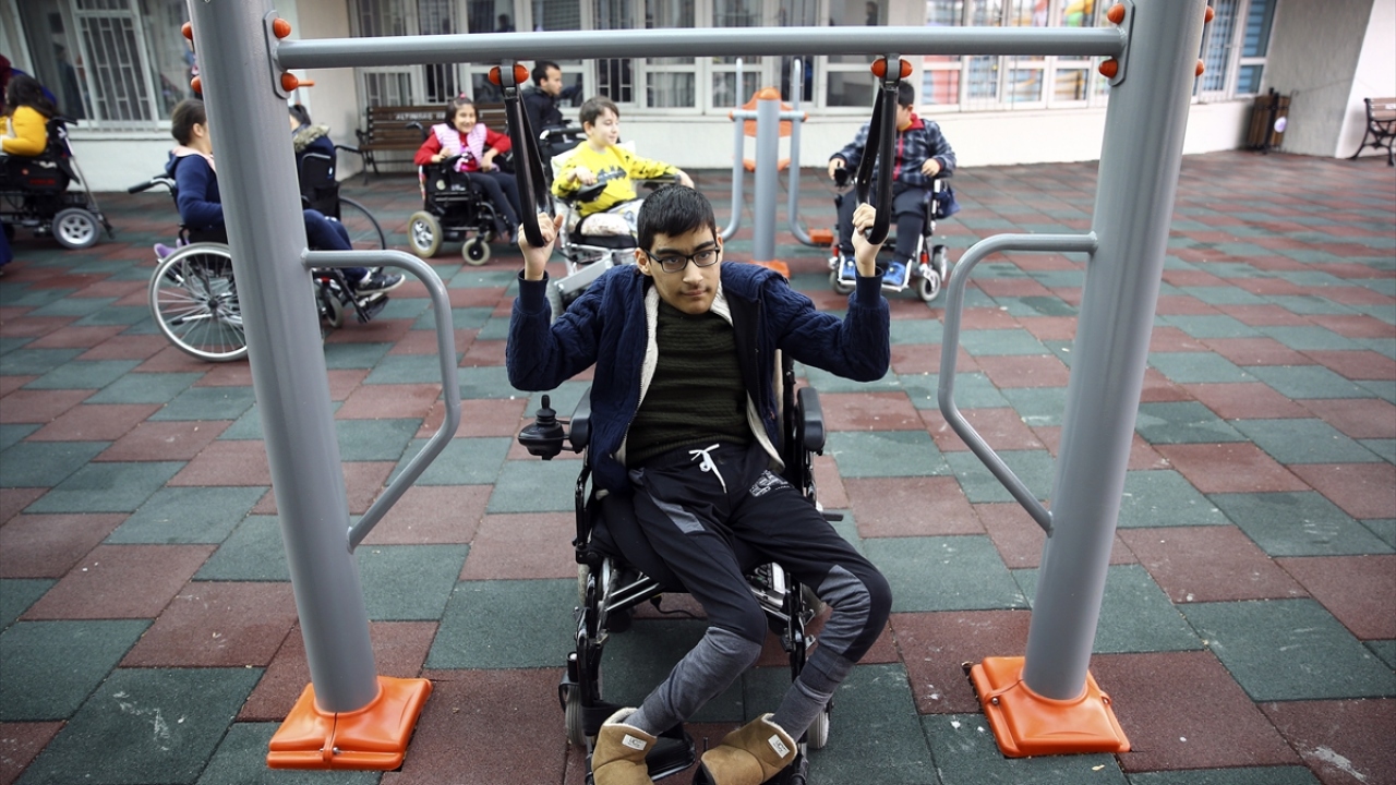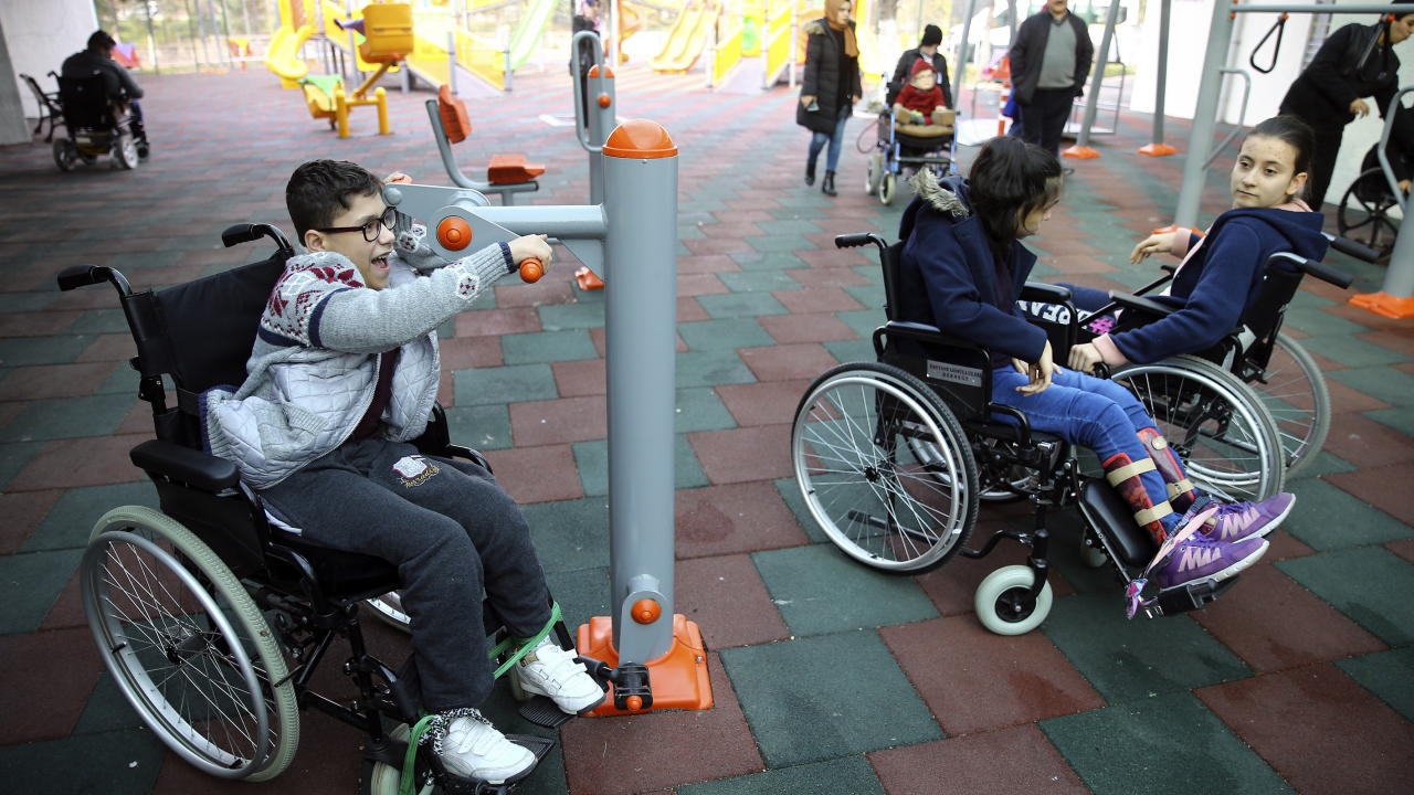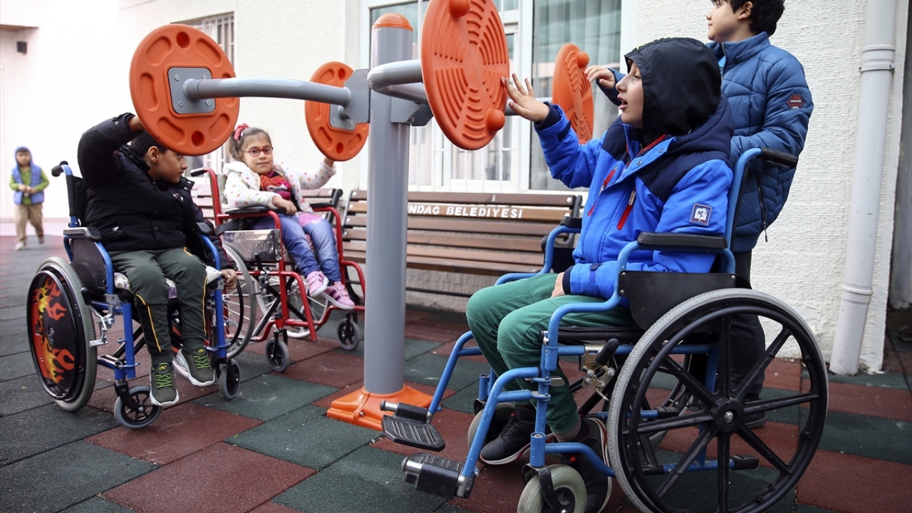 Doğan Çağlar Bedensel Engelliler İlkokulu ve Ortaokulu bahçesinde engelli öğrencilerin ihtiyaçlarına göre inşa edilen "engelsiz park"ta çocuklar, velileriyle keyifli vakit geçiriyor.