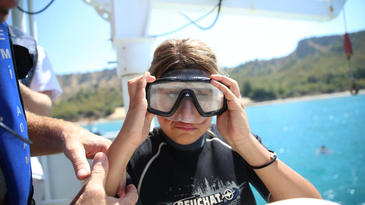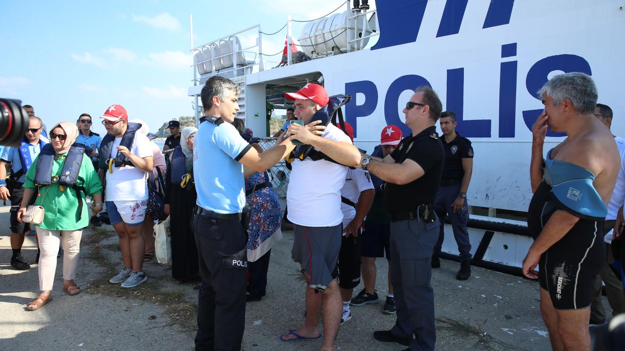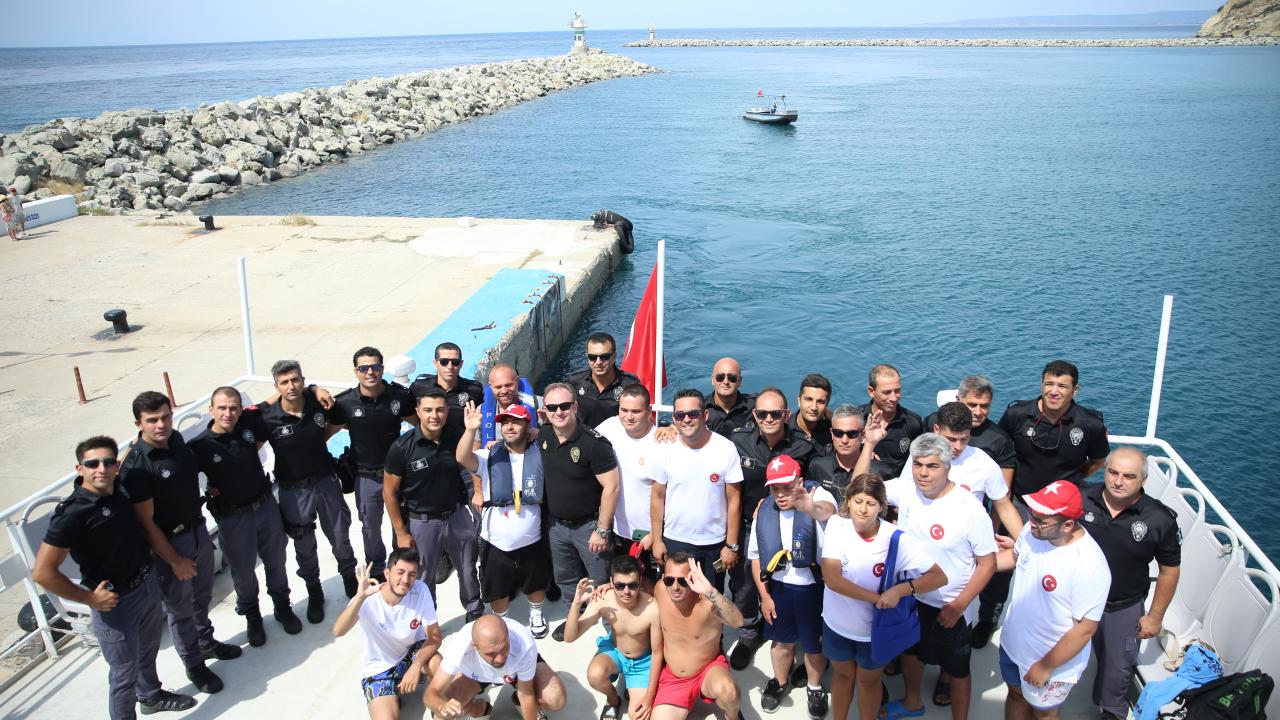 Buradan Çanakkale Emniyet Müdürlüğü Deniz Polis Eğitim Merkezi Müdürlüğüne ait "Şehit İdris Atalan" eğitim gemisiyle denize açılan engelliler ve aileleri, kısa bir yolculuğun ardından dalış yapılacak alana ulaştı.