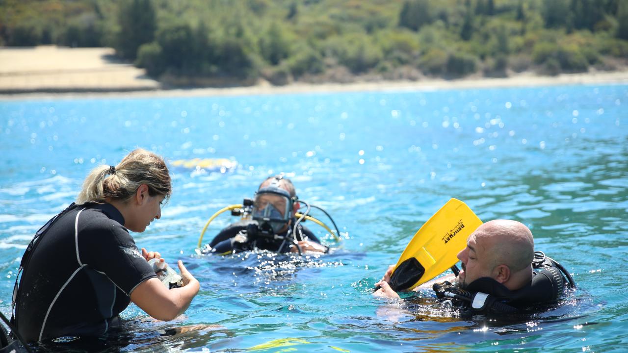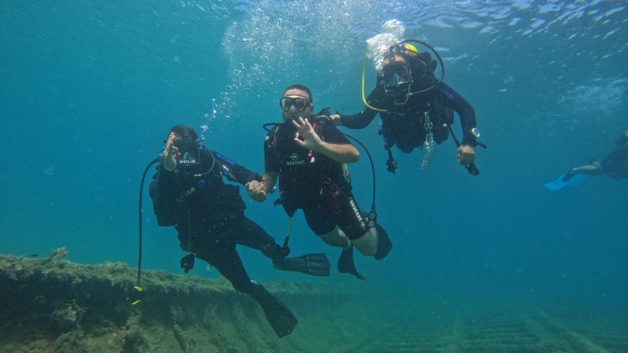 Dalış planının değerlendirilmesinin ardından 6 engelli dalıcı ve kurbağa adamlar, son hazırlıklarını tamamladı.