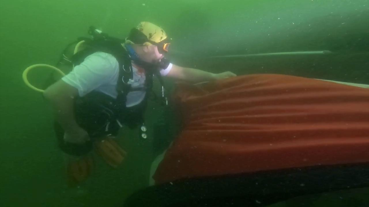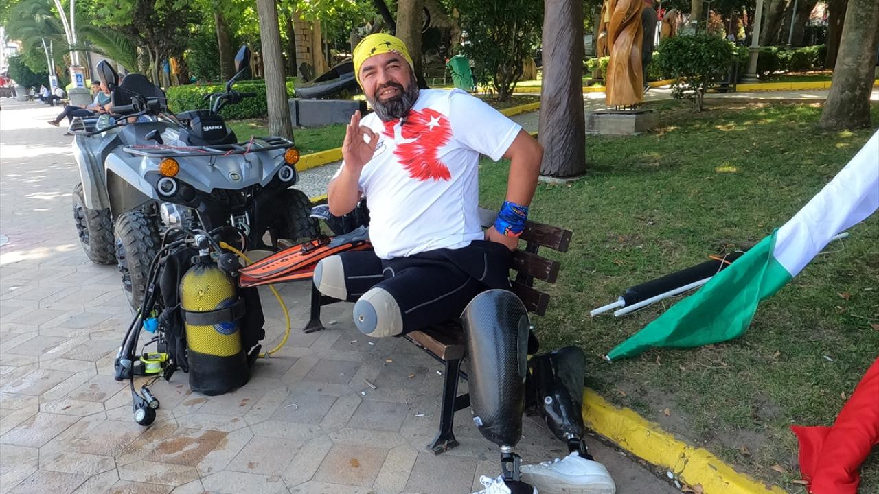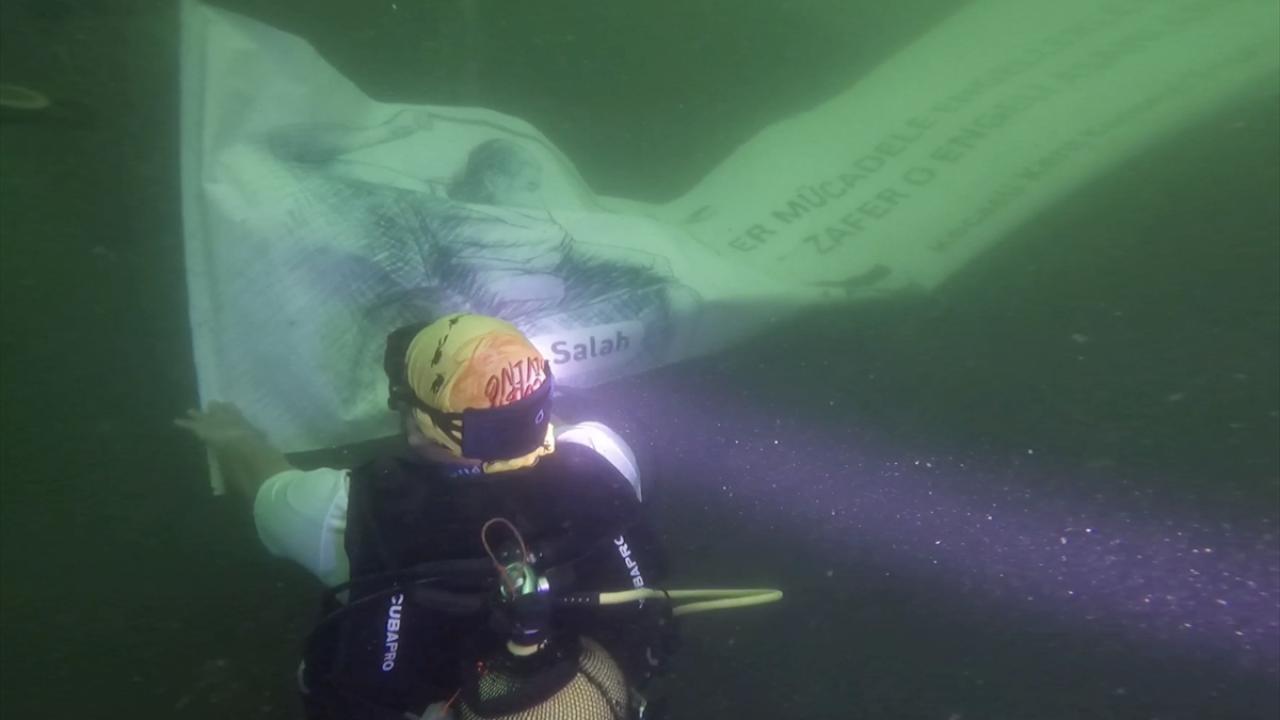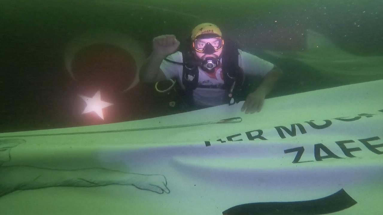 Suyun 24 metre derinliğindeki yatık çınar ağacına ulaşan Koçak ve Arslan, Türk ve Filistin bayraklarını dalgalandırdı.