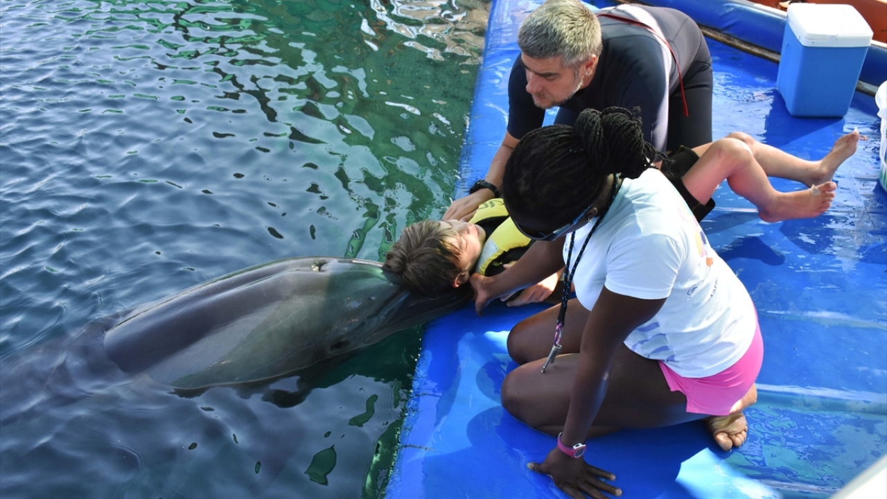Engelli çocuklar seanslarda yunuslarla yüzüp onlarla temas kuruyor.