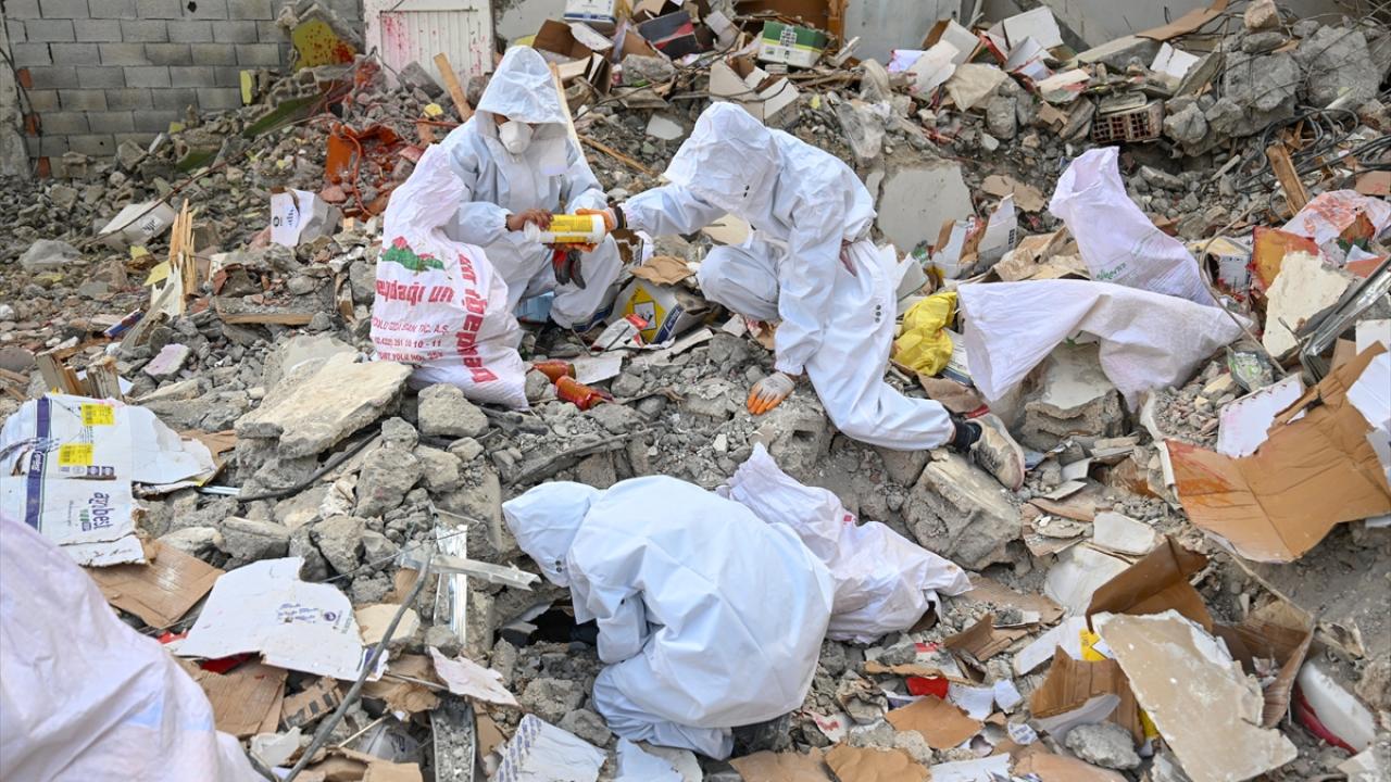 Koruyucu tulum giyen ekip, ilaçları, çevre ve insan sağlığına zarar vermeden yıkıntılar altından kontrollü şekilde çıkarıyor.