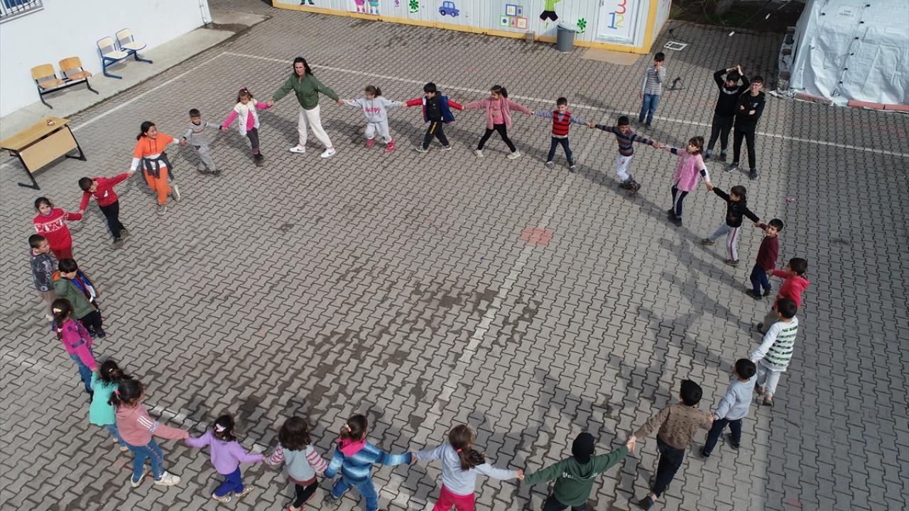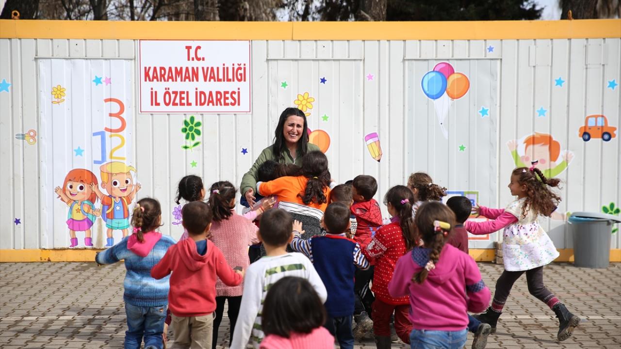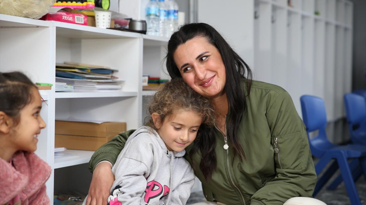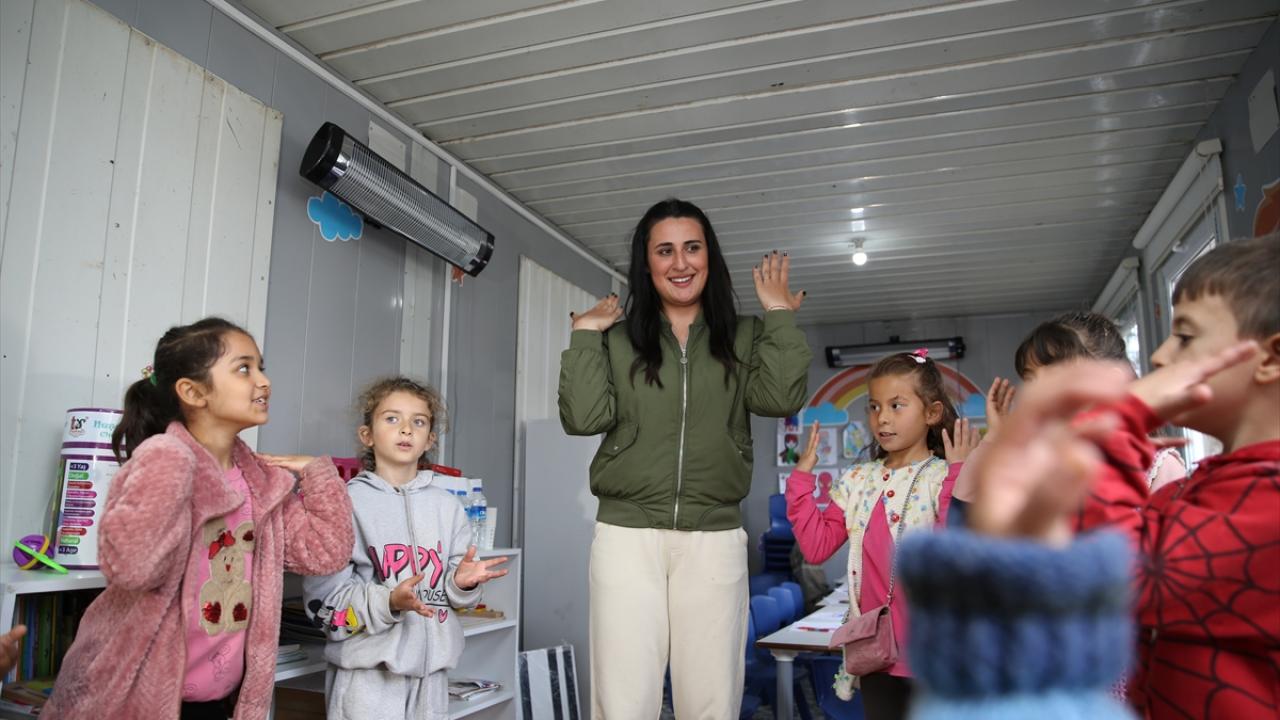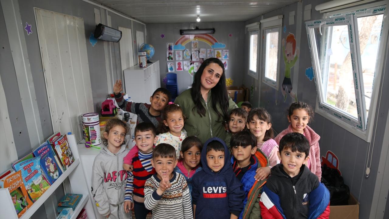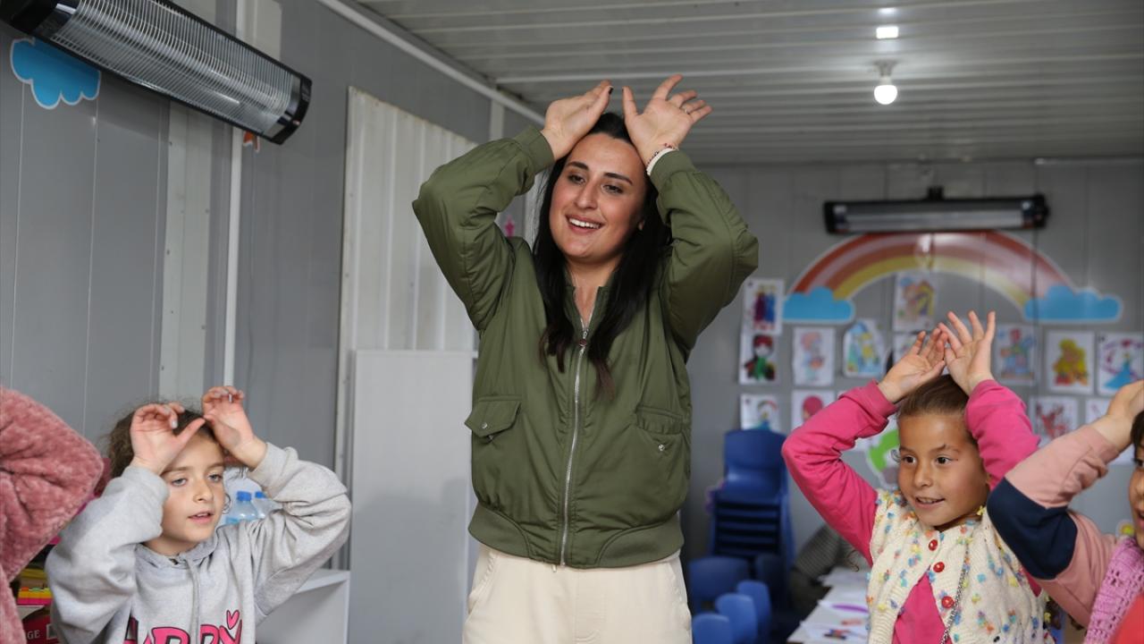 Hatay'da yıkılan binanın enkazından 56 saat sonra çıkarılan öğretmen Özgenur Demirci, Kahramanmaraş'ta bir konteyner sınıfta öğrencilerinin yüzlerini güldürebilmek için çabalıyor.