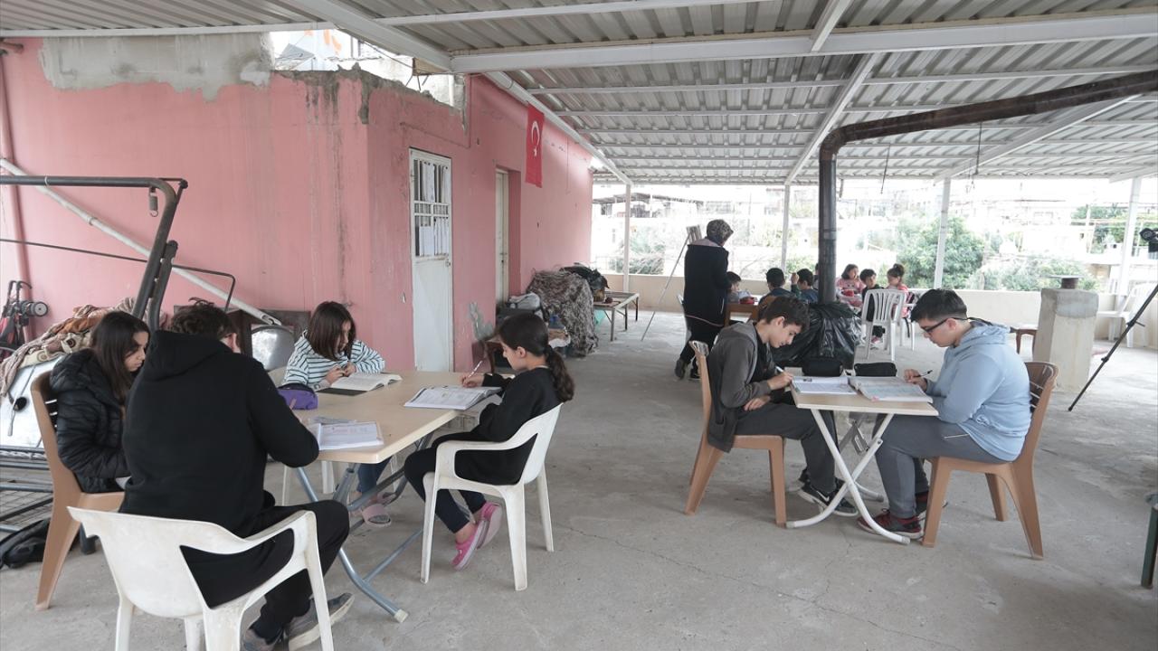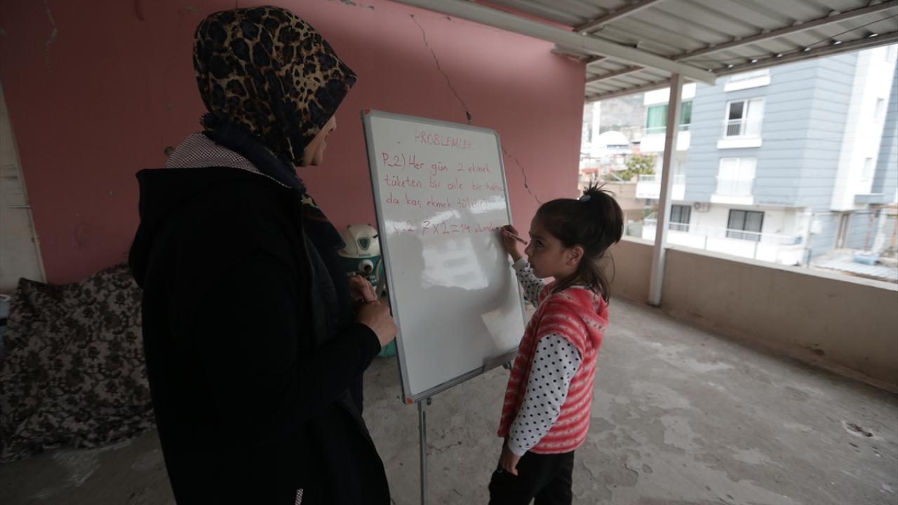 Hatay'da yıkılan binanın enkazından kurtulan sınıf öğretmeni Sibel Yıldız, İskenderun'da teyzesinin evinin teras katında oluşturduğu "teras sınıf"ta öğrencilerle bir araya geldi.