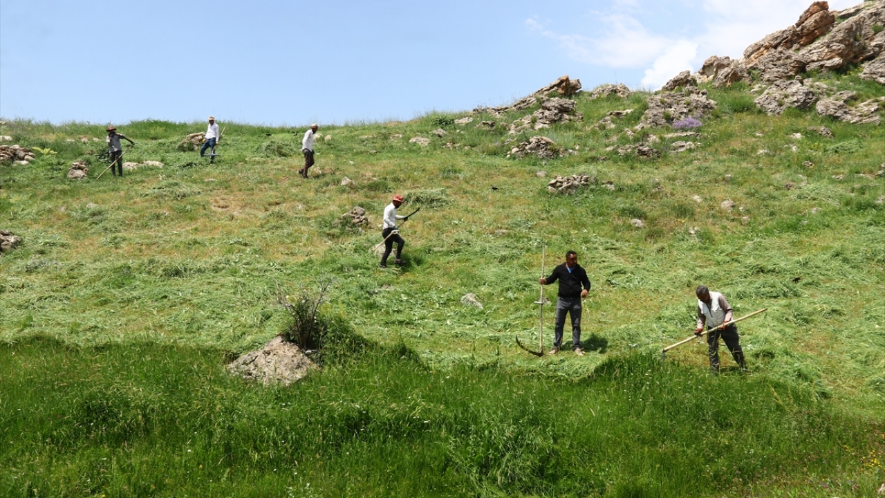 Van'ın Erciş ilçesinde çiftçiler, hayvanlarının kışlık yem ihtiyacını karşılamak için bunaltıcı sıcakta tırpanla ot biçiyor.