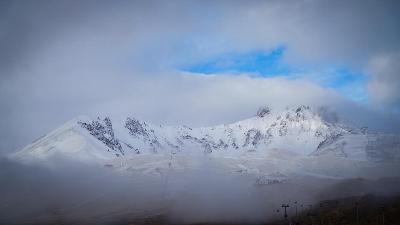 Yağış sonrası Erciyes Kayak Merkezi`nin yüksek rakımlı kesimleri karla kaplandı.