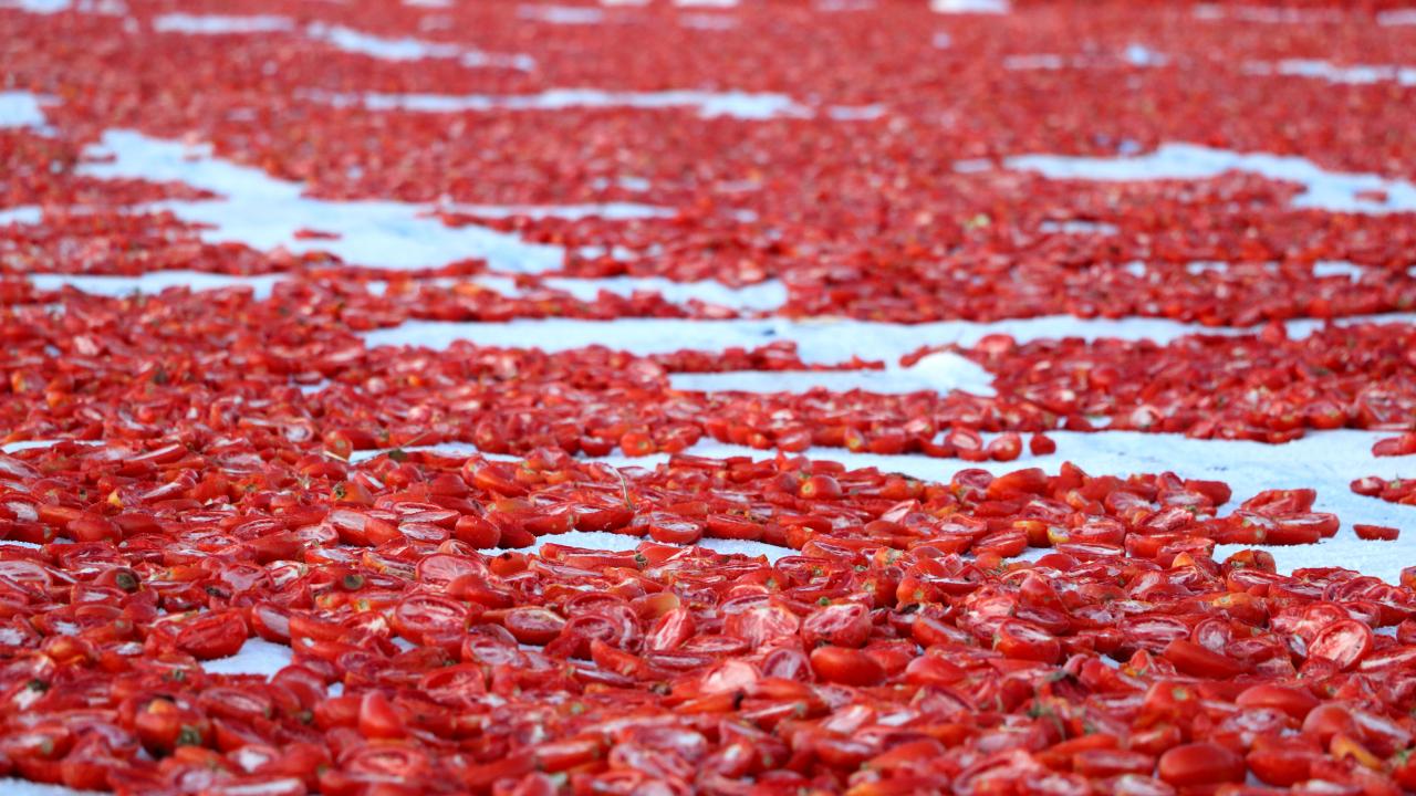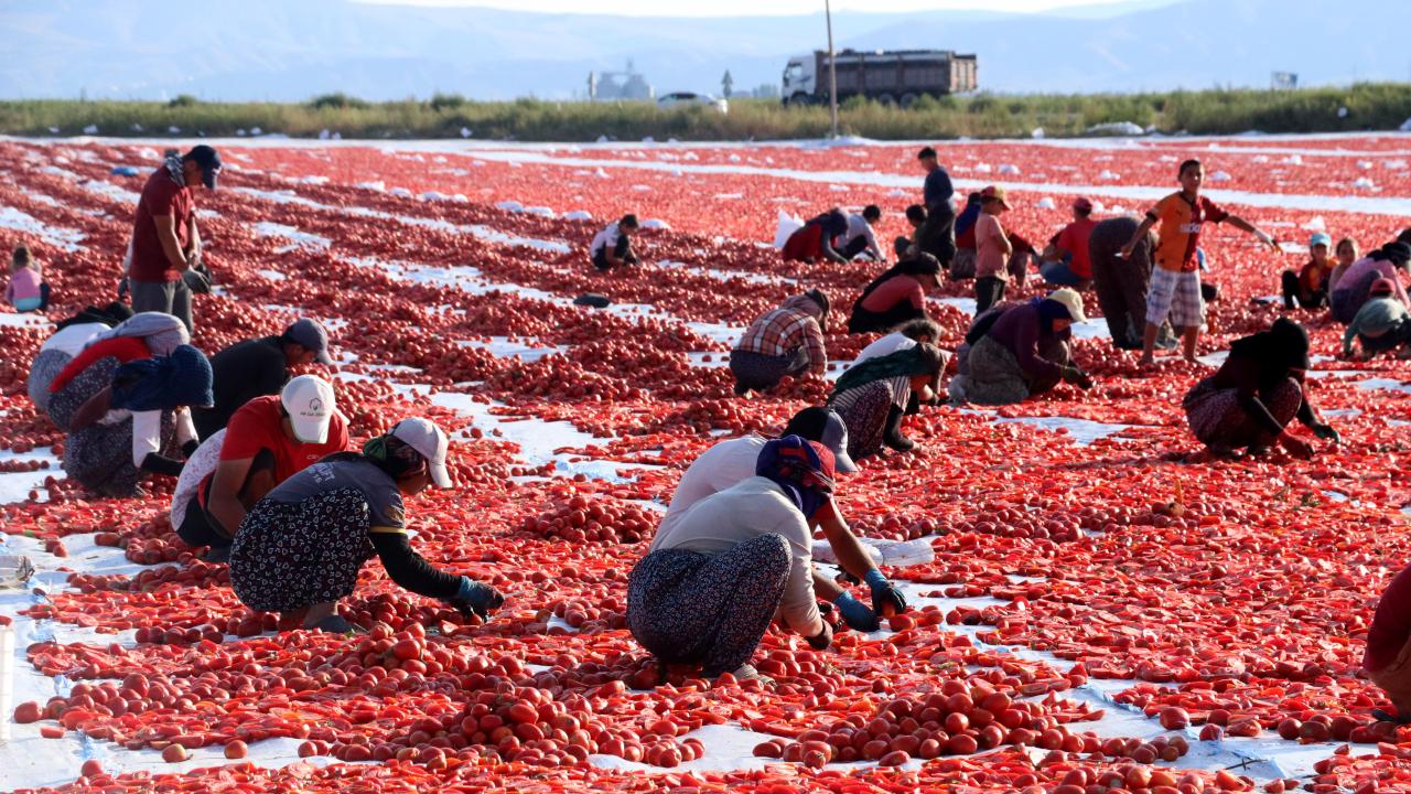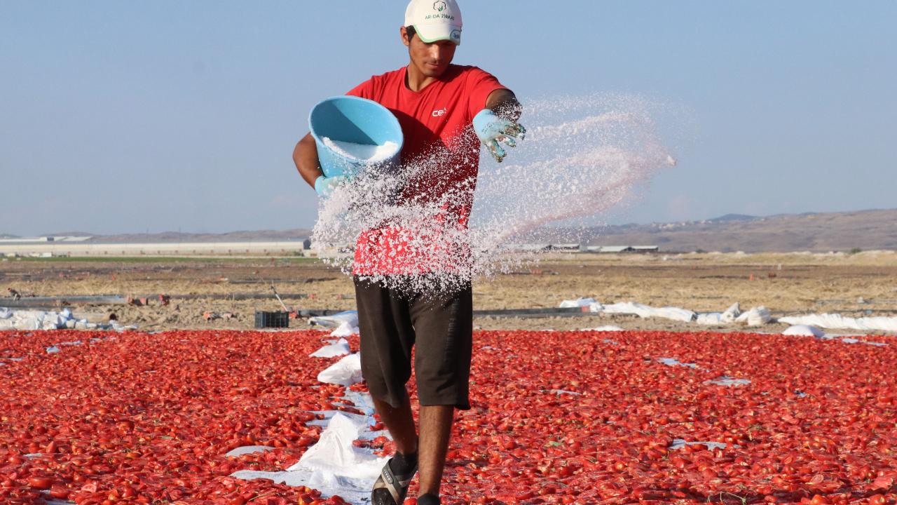 Burada, "kasacılar" denilen işçiler tarafından çadırların serili olduğu araziye indirilen domatesler, diğer çalışanlarca önce ortadan ikiye kesilip daha sonra tuzlanıyor.