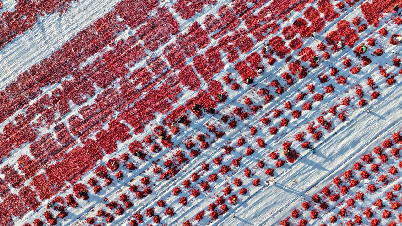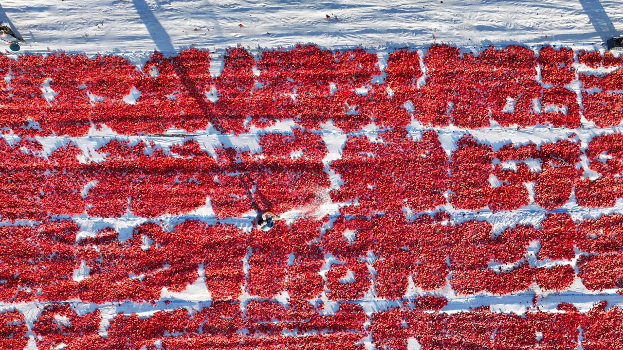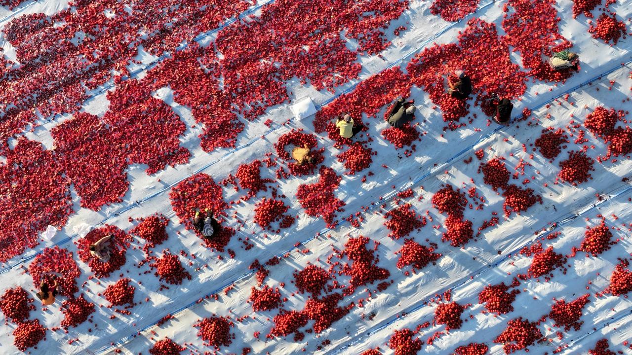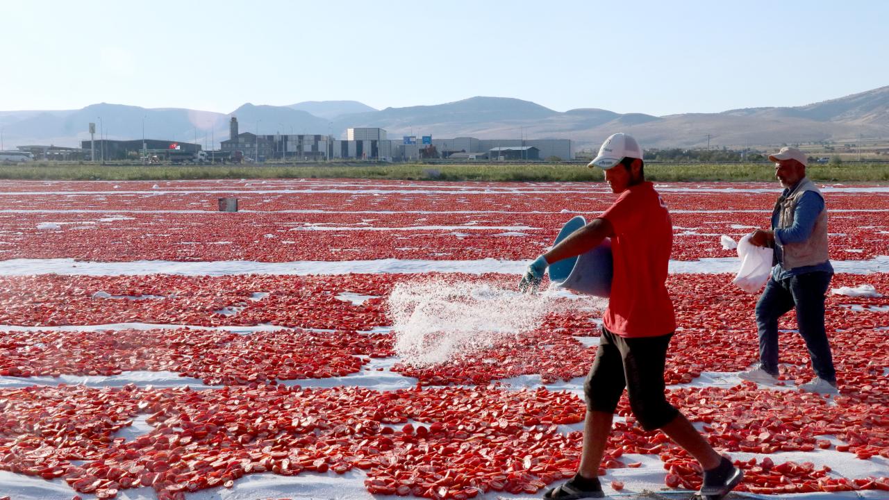Burada, "kasacılar" denilen işçiler tarafından çadırların serili olduğu araziye indirilen domatesler, diğer çalışanlarca önce ortadan ikiye kesilip daha sonra tuzlanıyor.