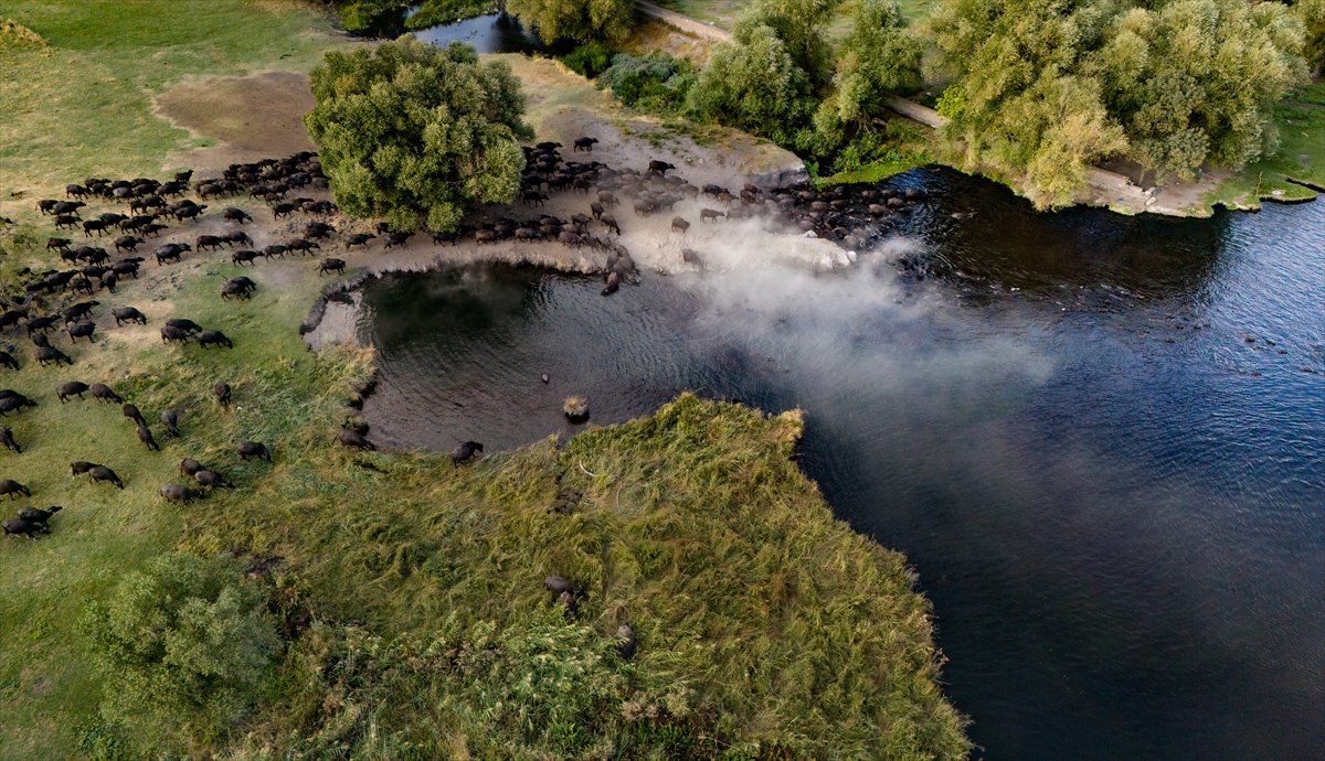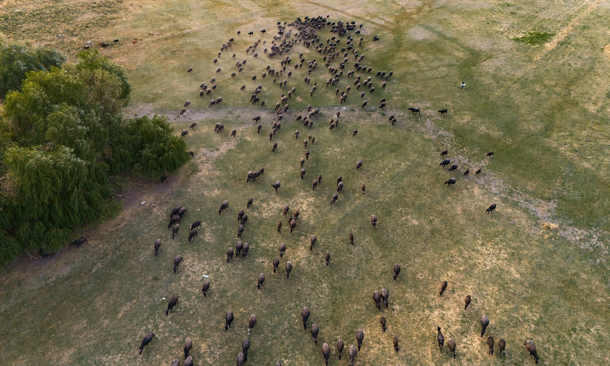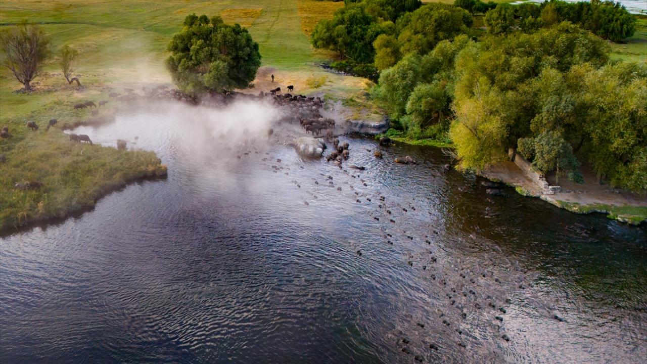 Güneş batmadan önce Dokuzpınar Mahallesi`ne dönmek için yola çıkan manda sürüsü, köydeki sulak alanda gün sonu banyosuna giriyor.