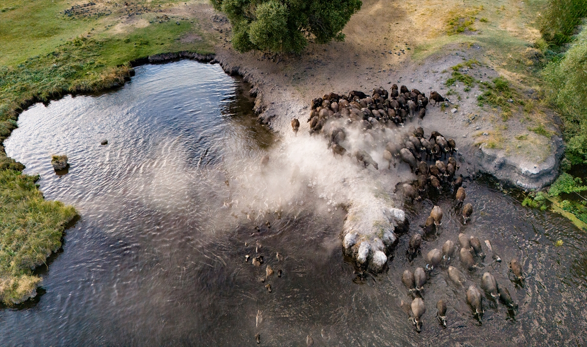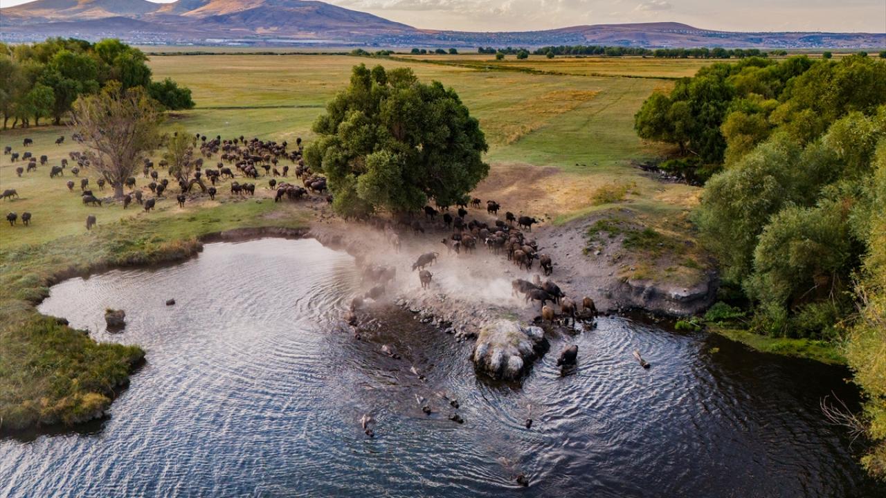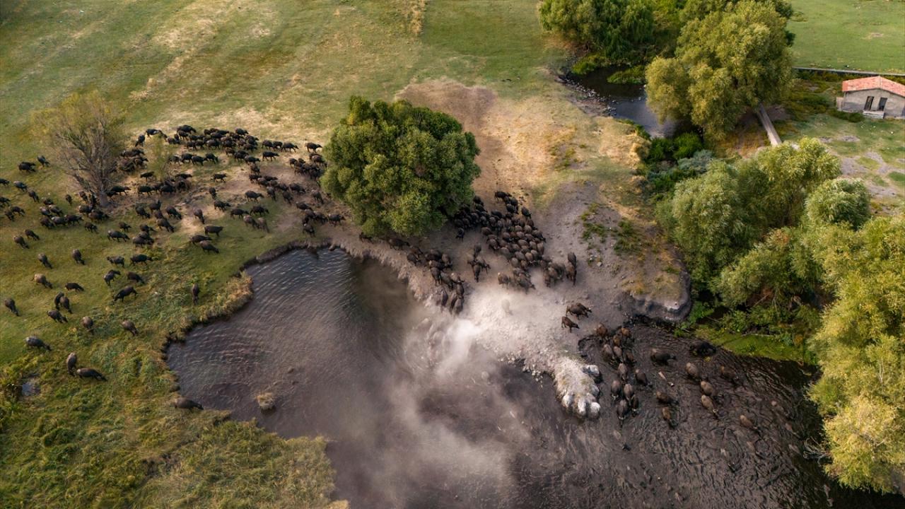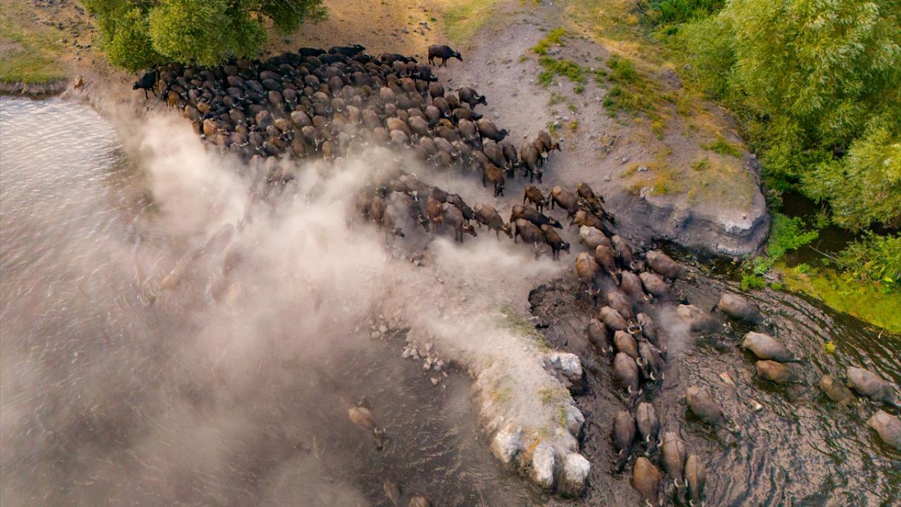 Kayseri'deki Erciyes Dağı eteklerinde yer alan Dokuzpınar Mahallesi sakinlerinin geçim kaynağı olan mandaların toplu halde Hürmetçi Sazlığı'nda yayıldıktan sonra dönüş yolundaki sulak alanda yaptıkları banyo, izleyenleri etkiliyor.