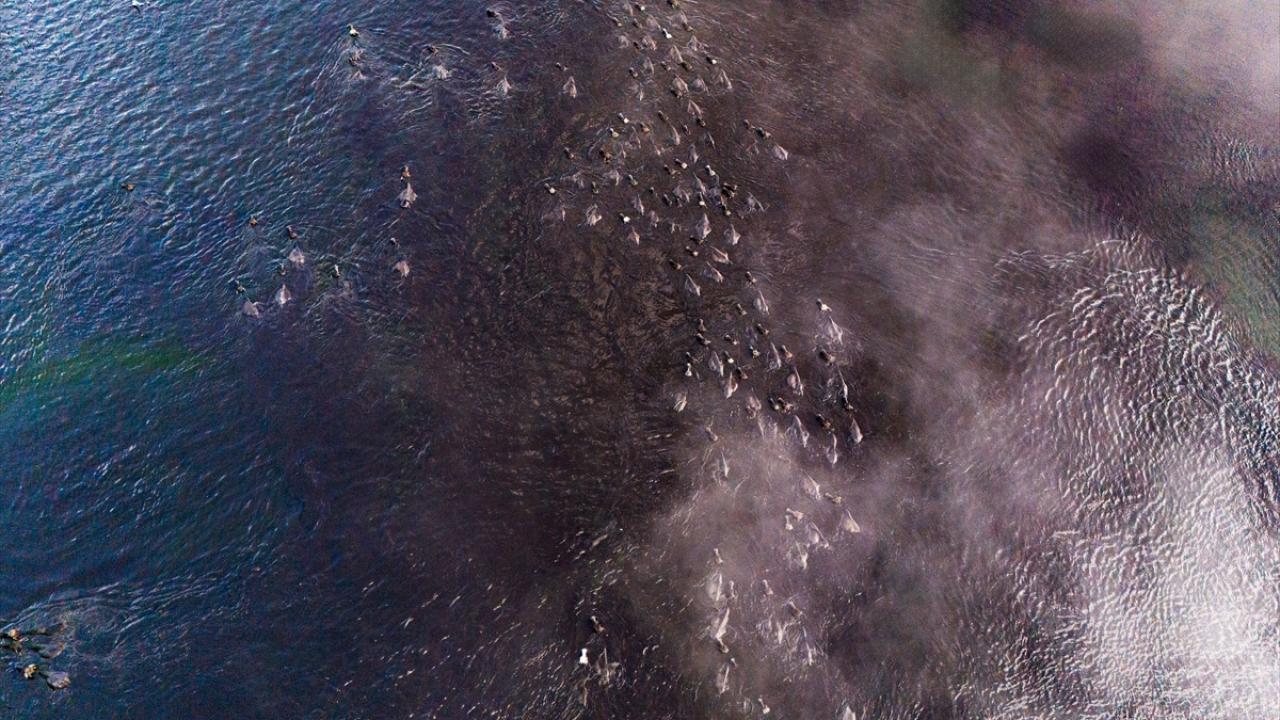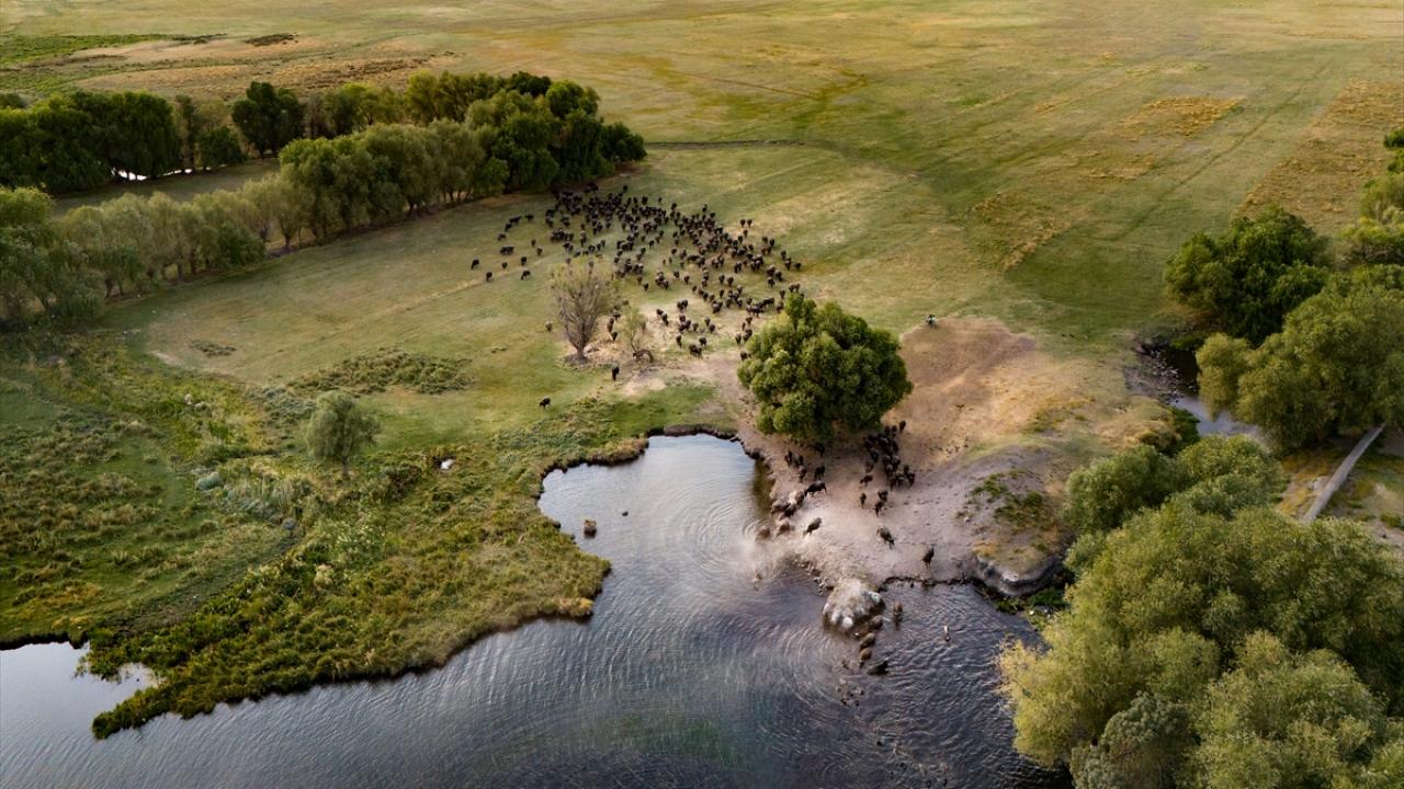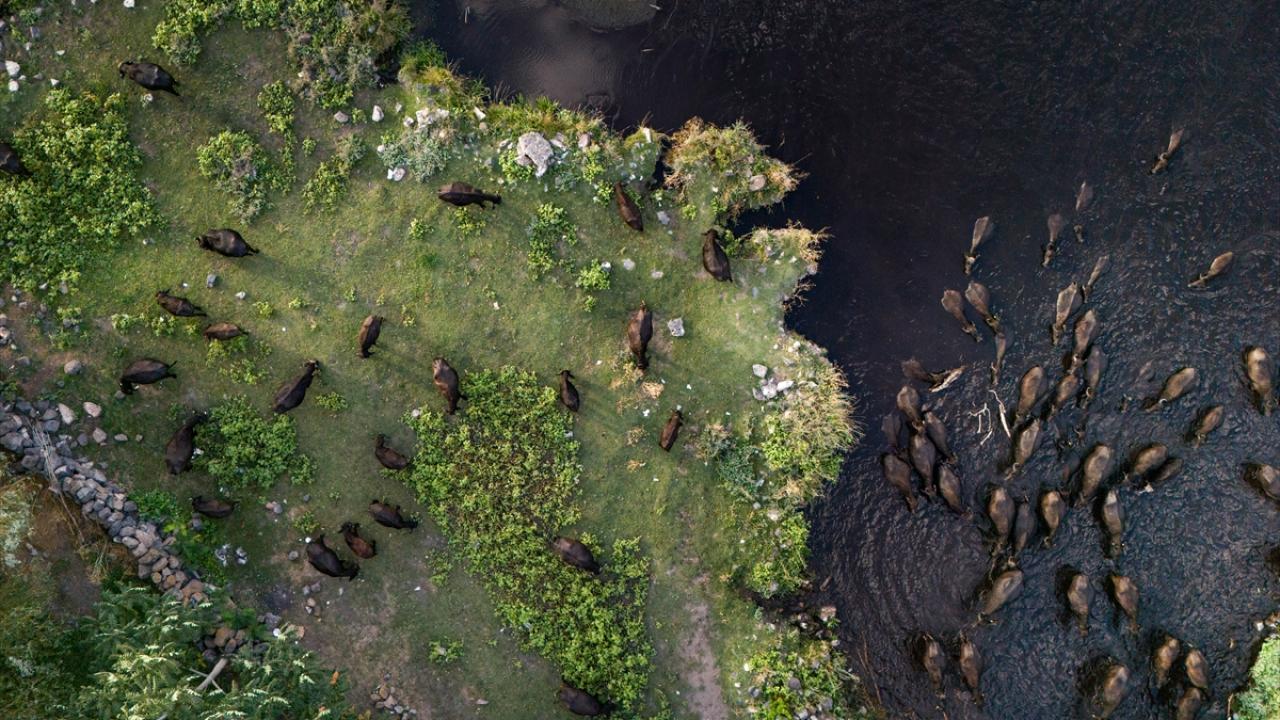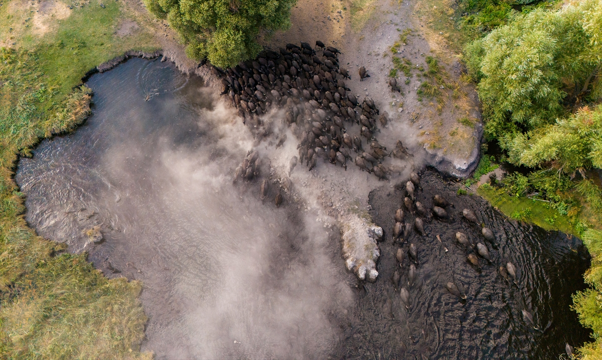 Kayseri'deki Erciyes Dağı eteklerinde yer alan Dokuzpınar Mahallesi sakinlerinin geçim kaynağı olan mandaların toplu halde Hürmetçi Sazlığı'nda yayıldıktan sonra dönüş yolundaki sulak alanda yaptıkları banyo, izleyenleri etkiliyor.