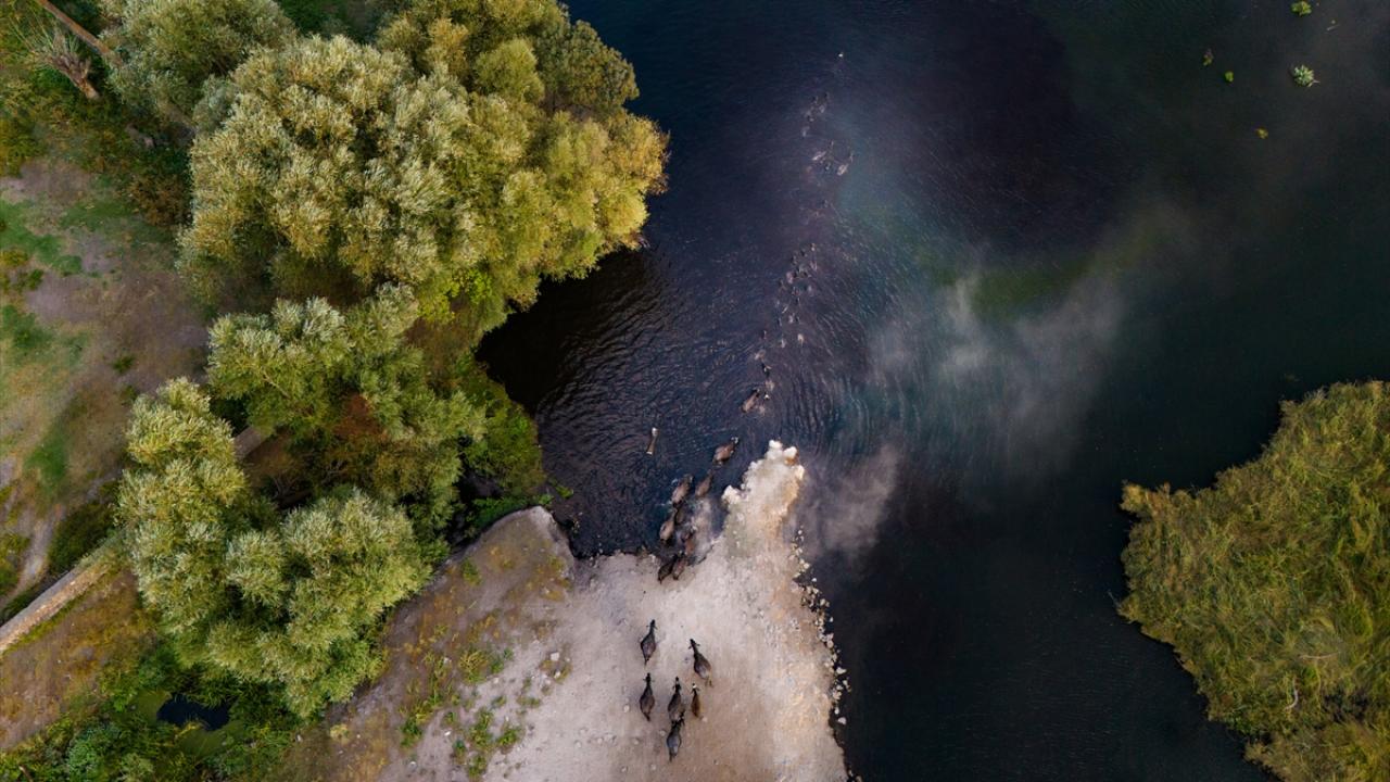 Sulak alanda yüzen mandalar, günün yorgunluğunu burada atıyor ve temizleniyor.